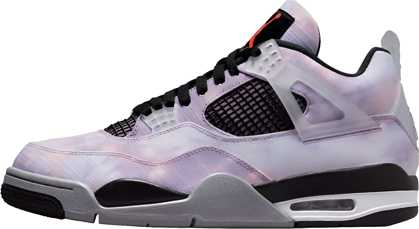 La Air Jordan 4 Zen Master se pare d'une base en toile reprenant des tonalités de couleurs pastel qui ne sont pas sans rappeler la voie lactée et la galaxie. On retrouve le traditionnel empiècement en TPU translucide sur le quarter panel, ainsi que quelques rappels de noir en guise de contraste sur les lacets, la midsole et le quadrillage.