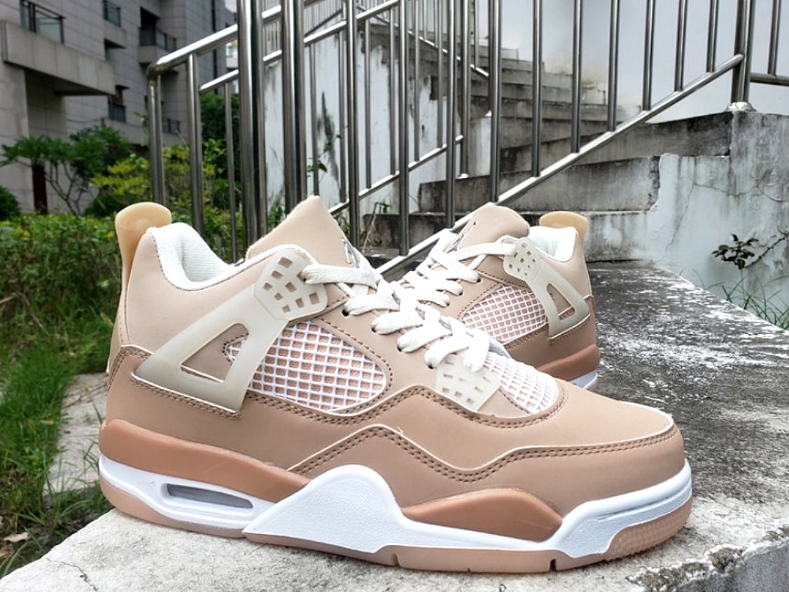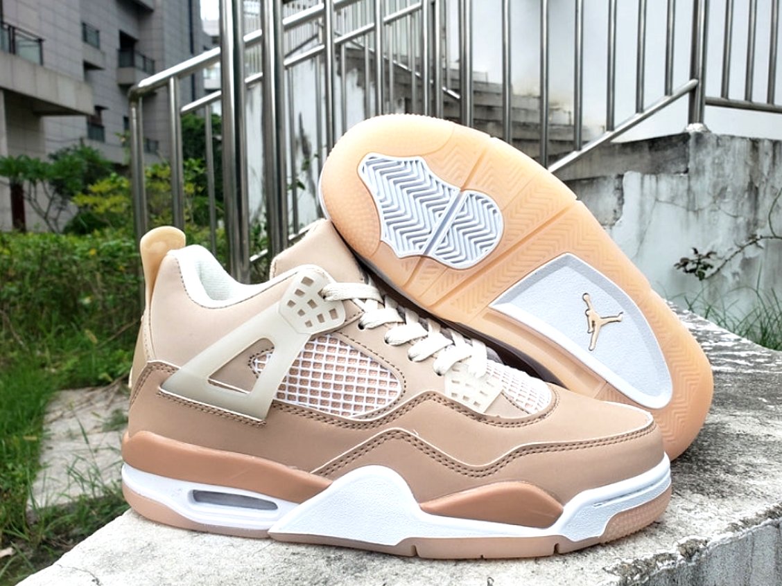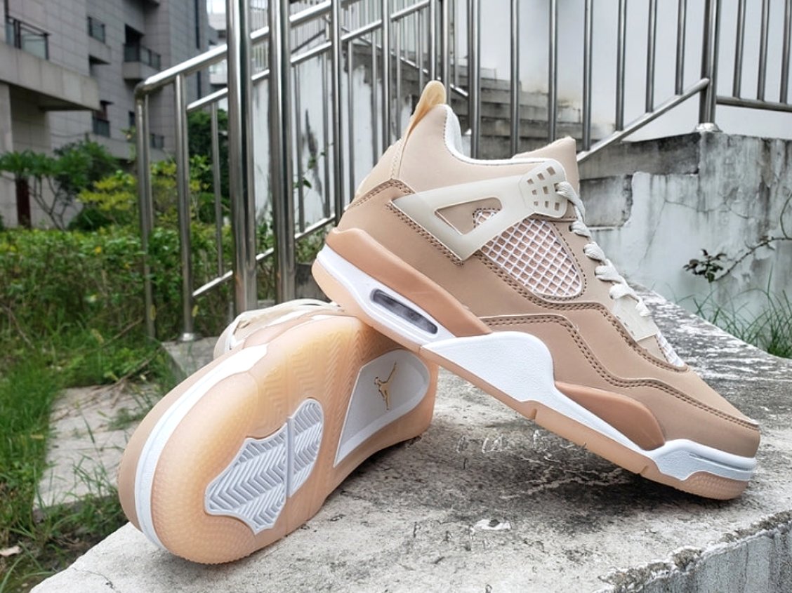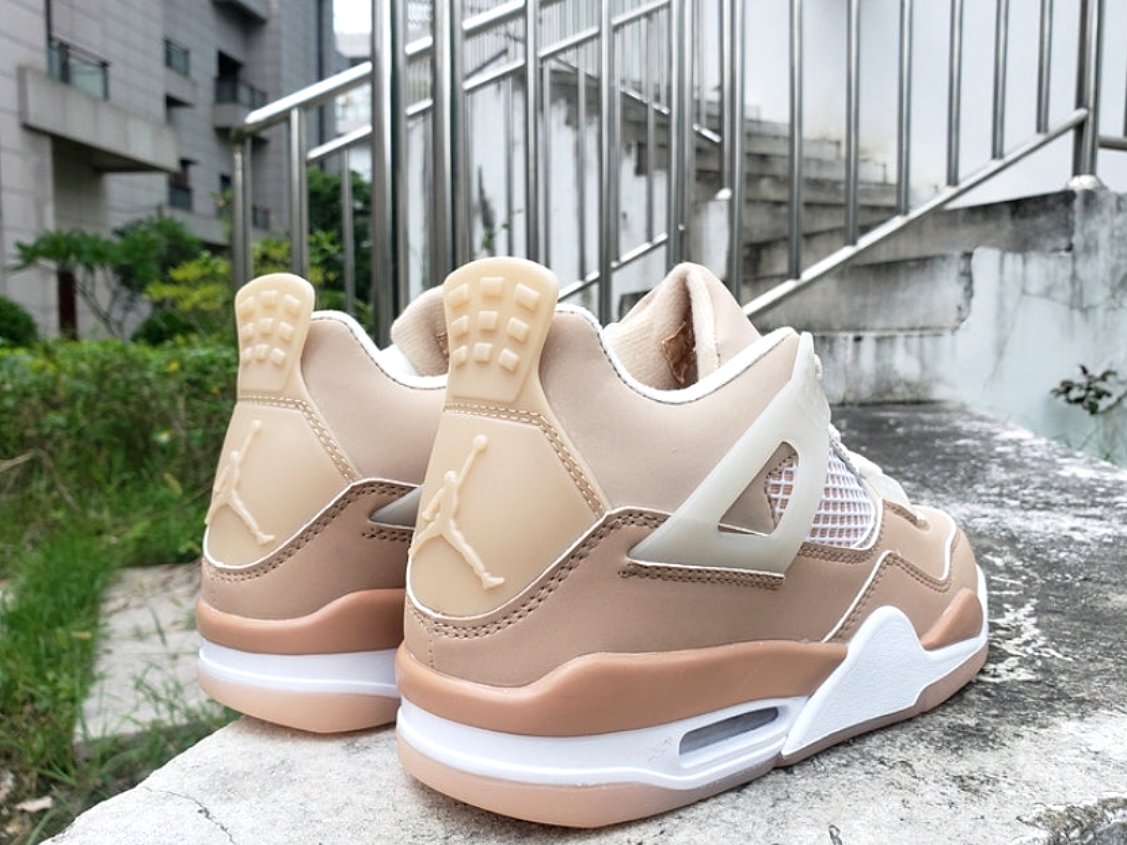 La Air Jordan 4 Shimmer présente une empeigne oscillant entre des teintes beige et rose pâle. On note plusieurs rappels orangés près de la midsole et du talon. On retrouve l'habituel empiècement légèrement translucide combinée à une cage latérale quadrillée. Un Jumpman sur la languette peaufine le tout.