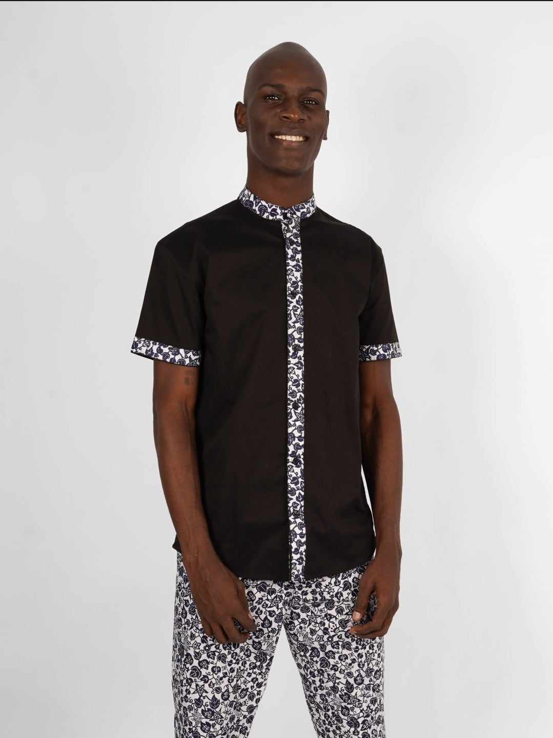 Cette chemise cintrée à manches courtes tire son énergie d’un subtil mélange entre le wax et le coton unicolore.