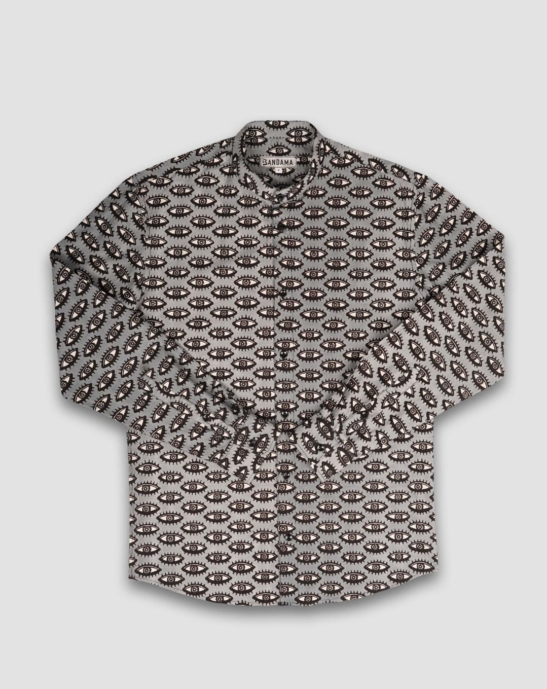 Cette chemise cintrée à manches longues tire son énergie d’un subtil mélange entre le wax et le coton unicolore.