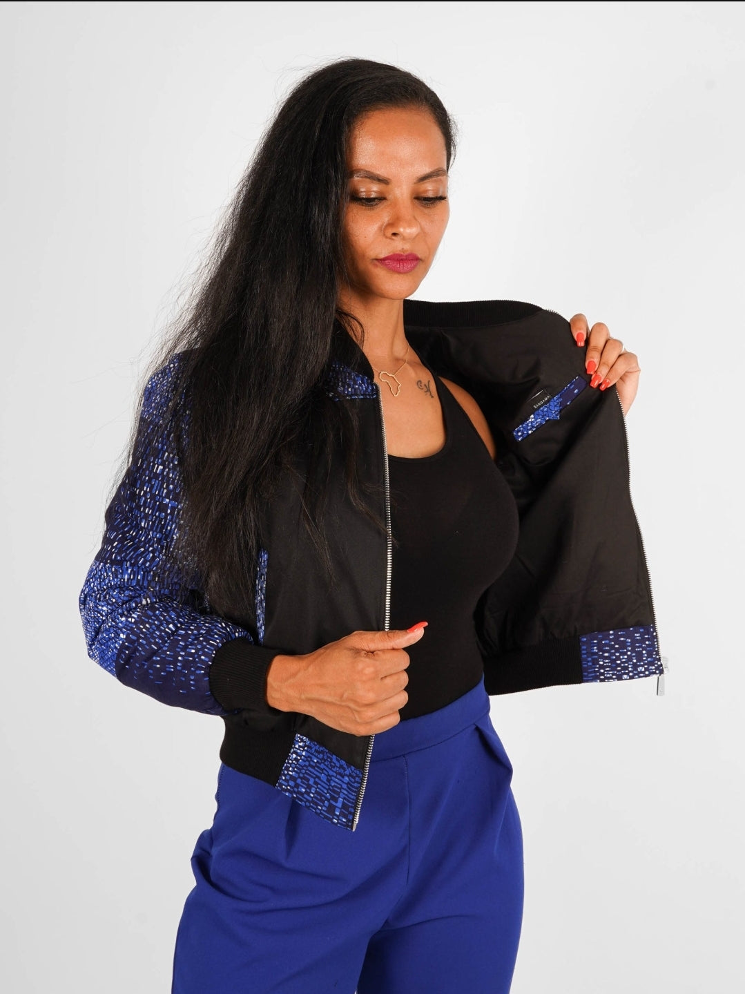 Ce bomber rembourré est confectionné en wax authentique, produit en Côte d’Ivoire et constitué à 100% de coton.