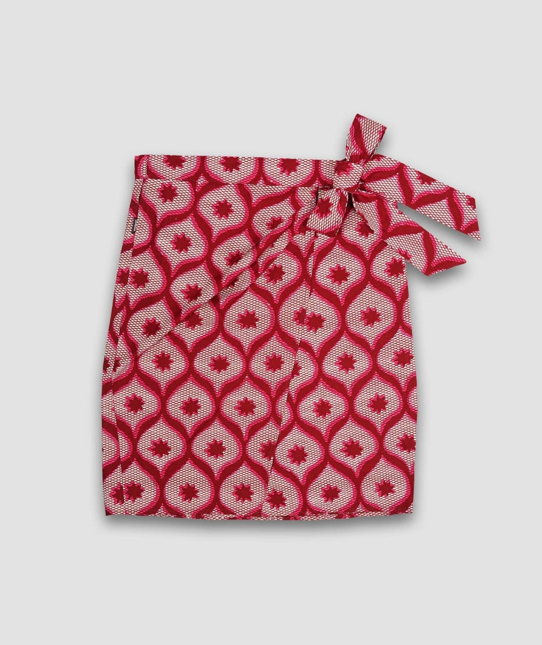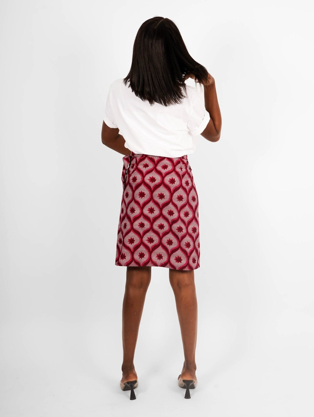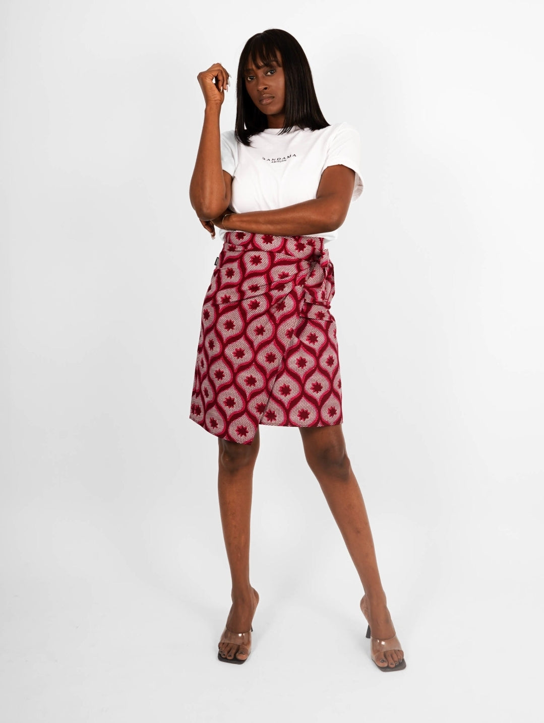 Cintrée à la taille et ajustable par nœud, cette jupe est confectionnée en wax authentique, produit en Côte d’Ivoire et constitué à 100% de coton.