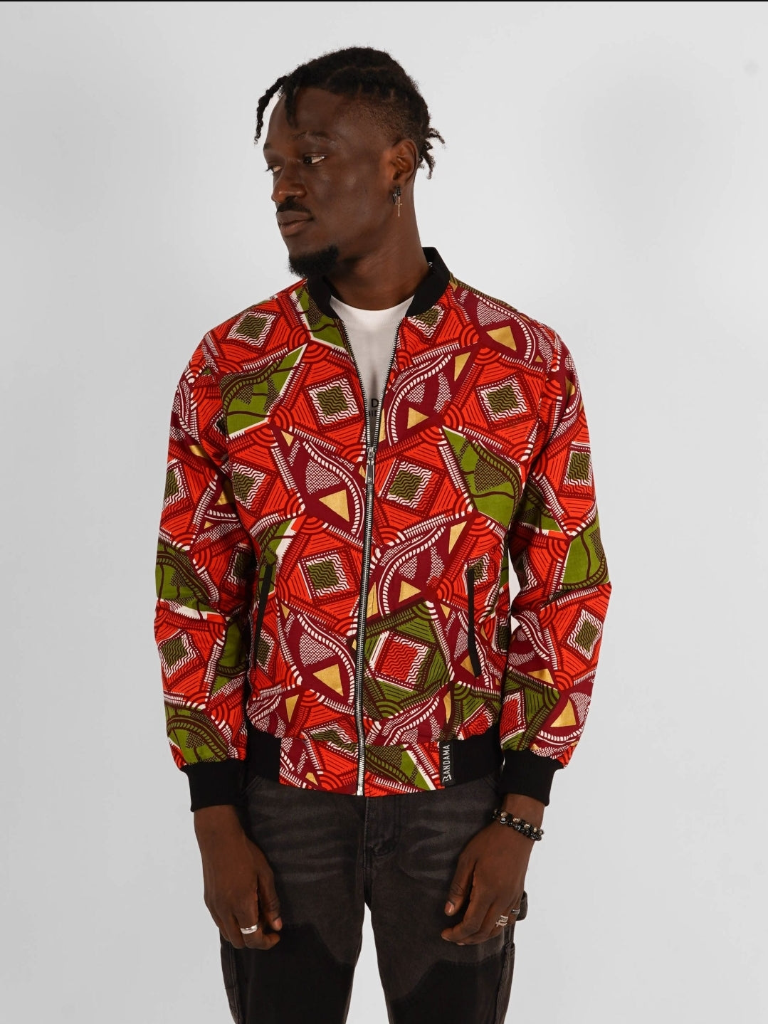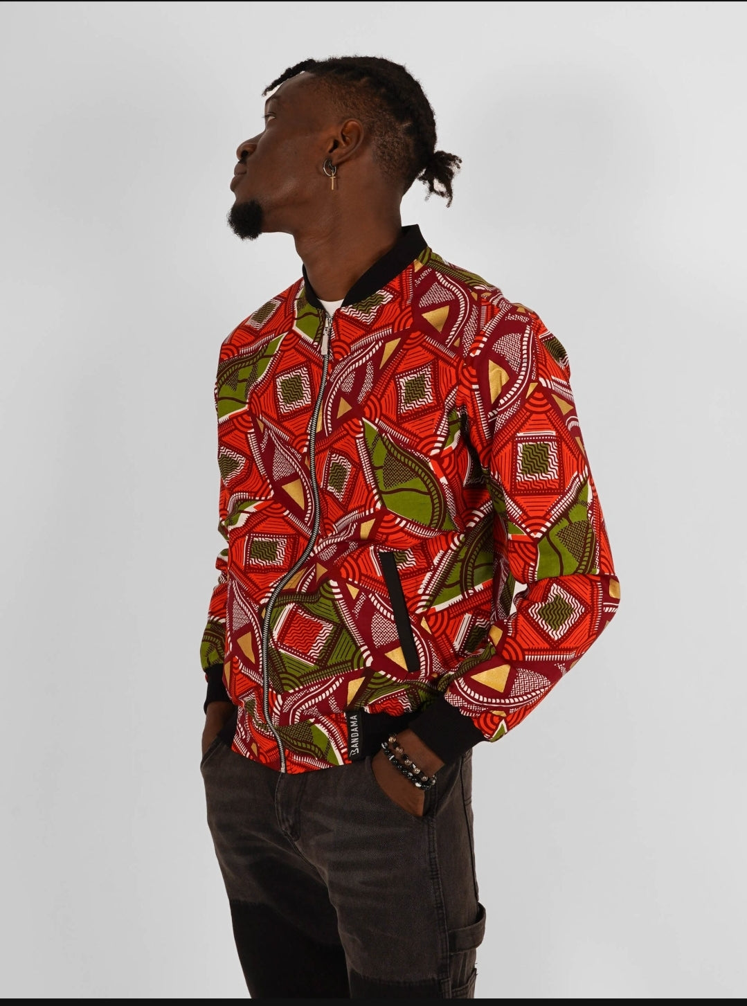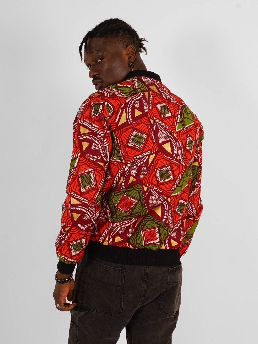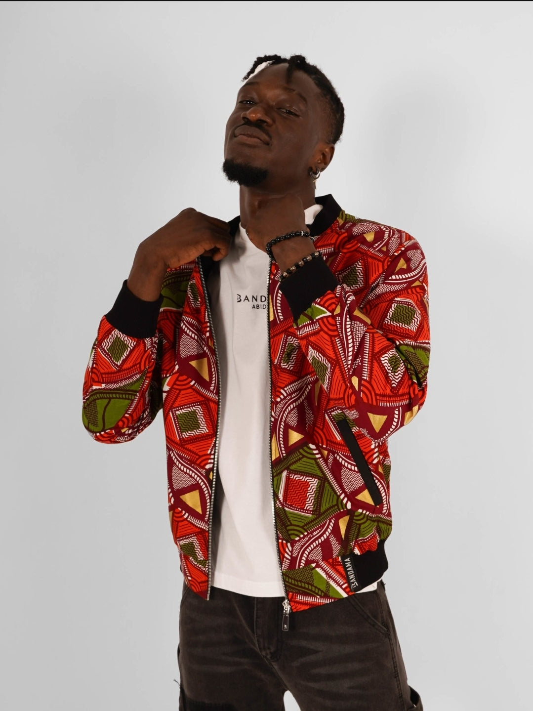Ce bomber est confectionné en wax authentique, produit en Côte d’Ivoire et constitué à 100% de coton.