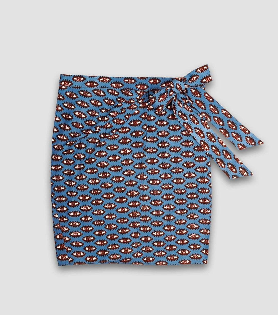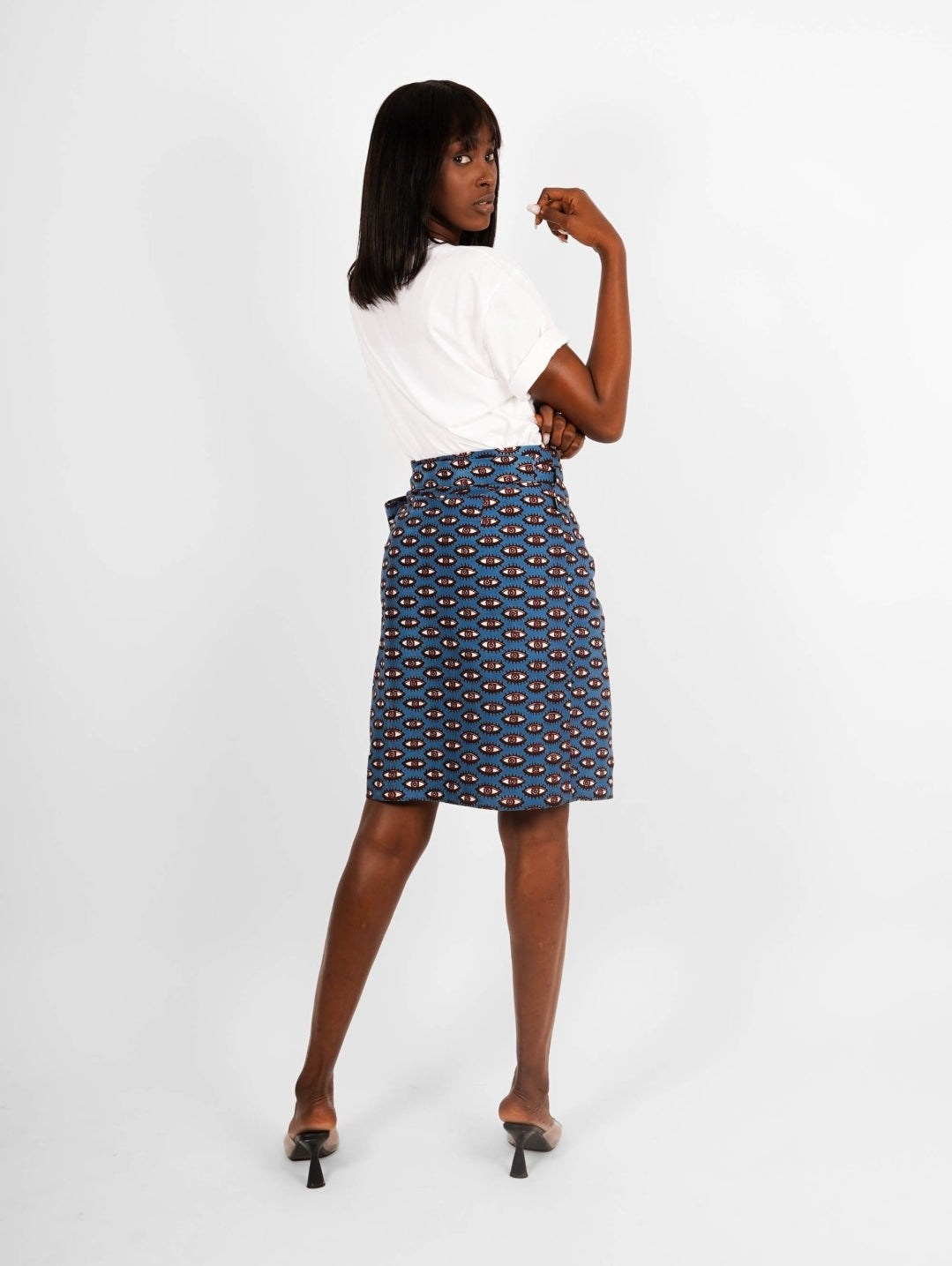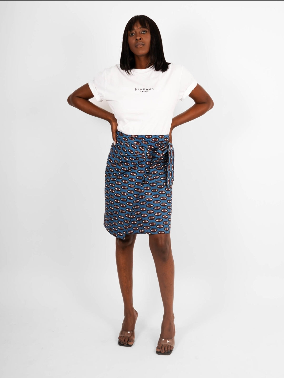 Cintrée à la taille et ajustable par nœud, cette jupe est confectionnée en wax authentique, produit en Côte d’Ivoire et constitué à 100% de coton.