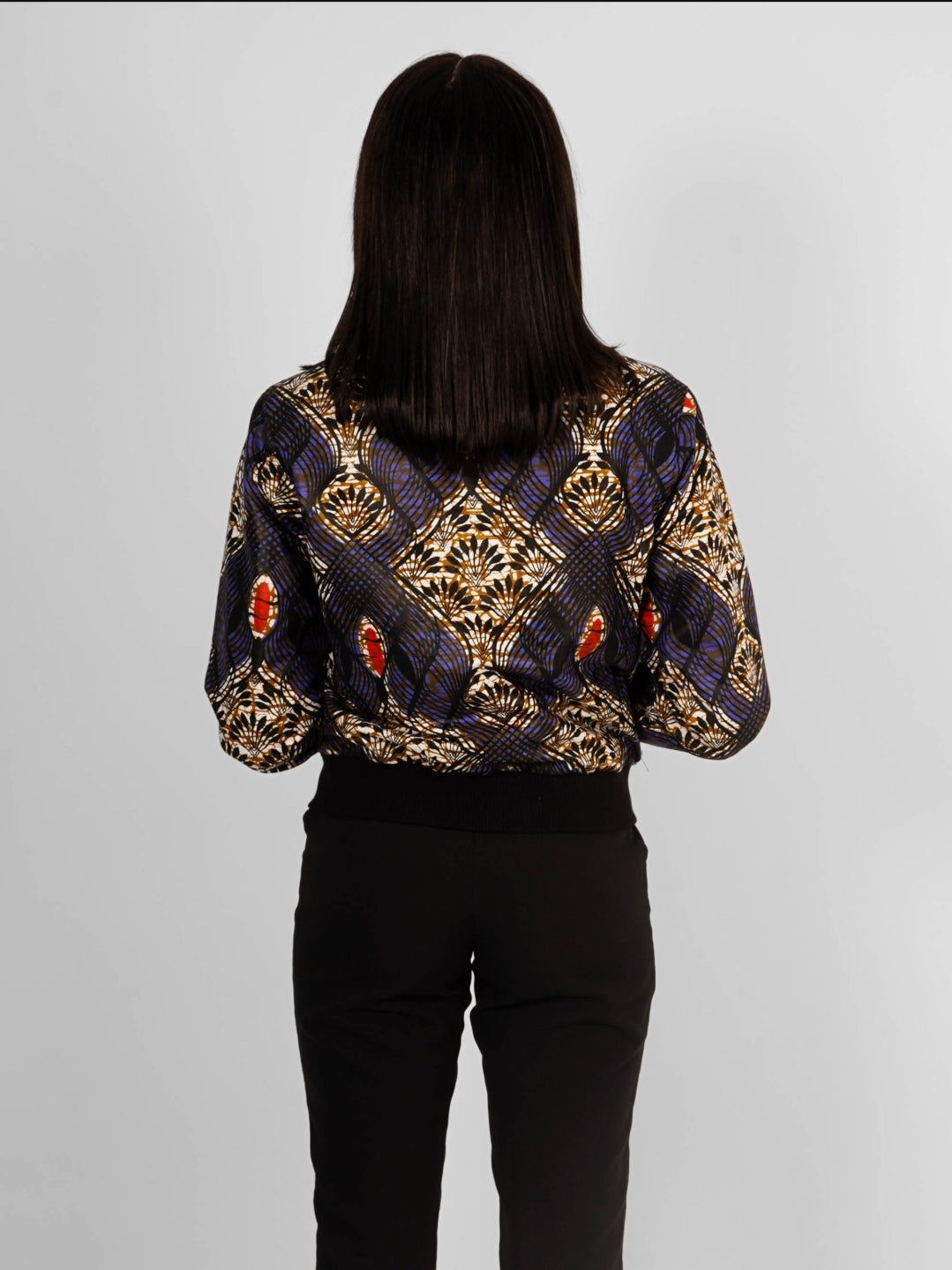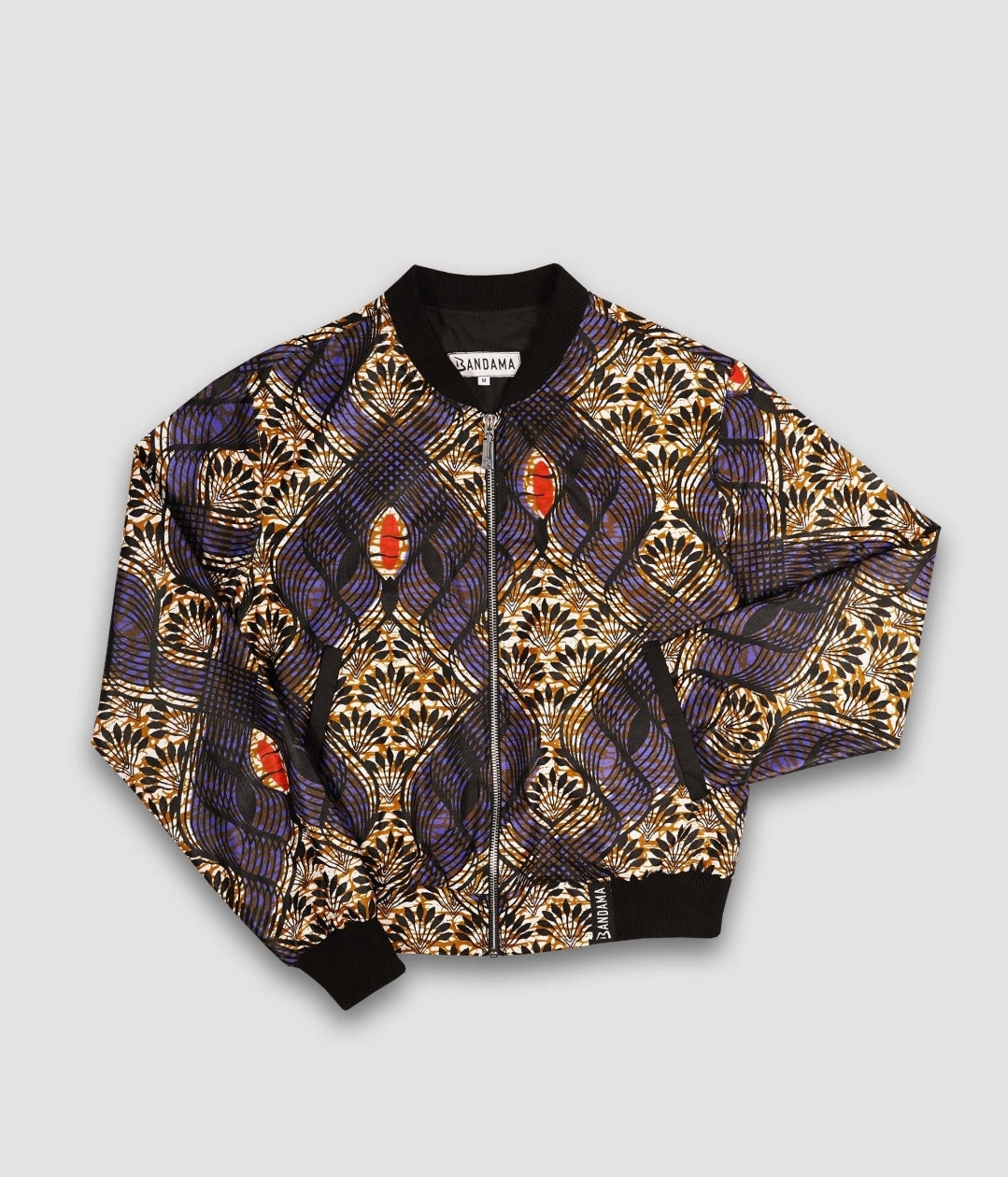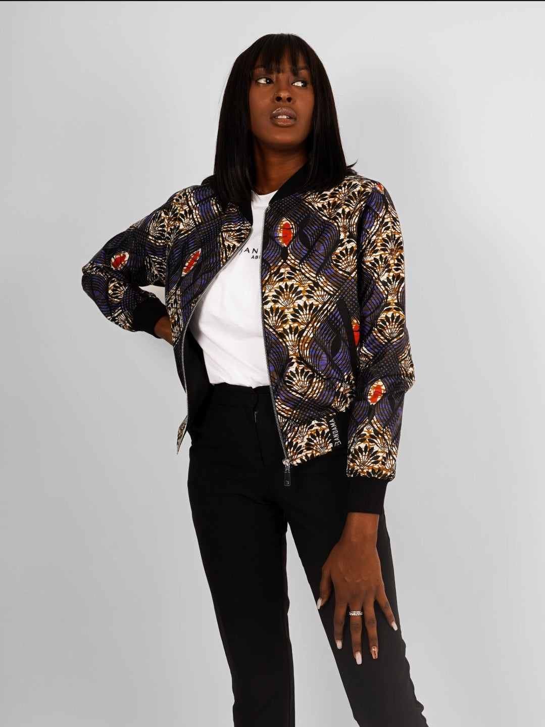 Ce bomber est confectionné en wax authentique, produit en Côte d’Ivoire et constitué à 100% de coton.