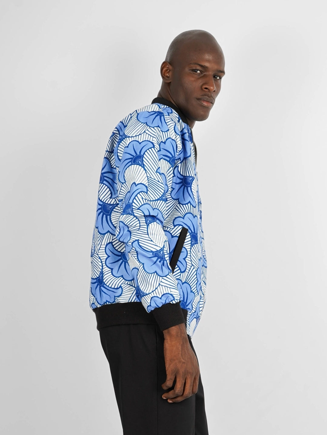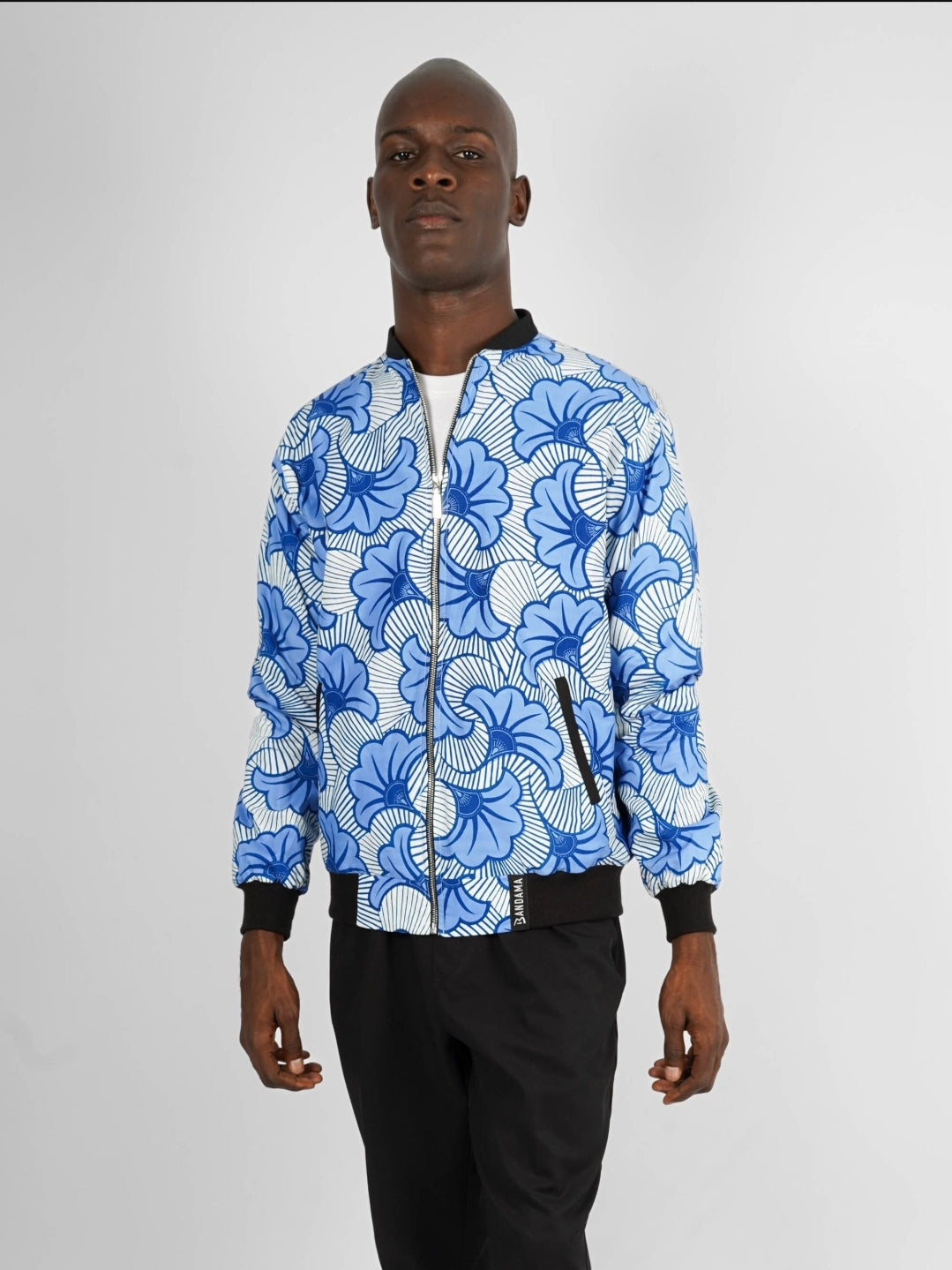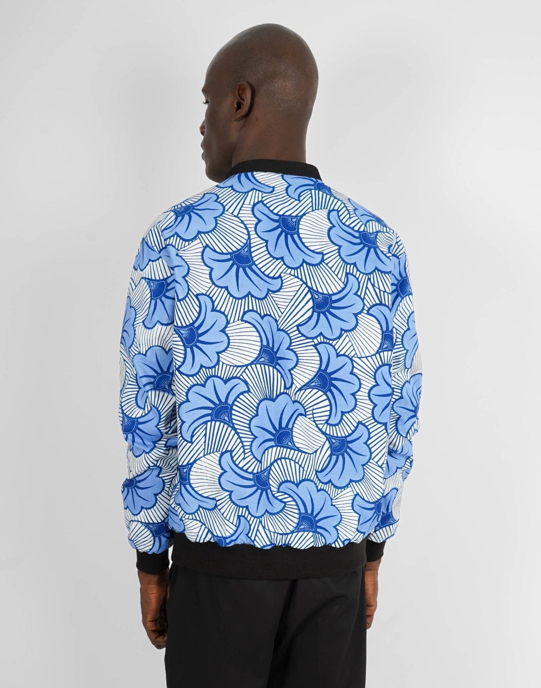 Ce bomber est confectionné en wax authentique, produit en Côte d’Ivoire et constitué à 100% de coton.