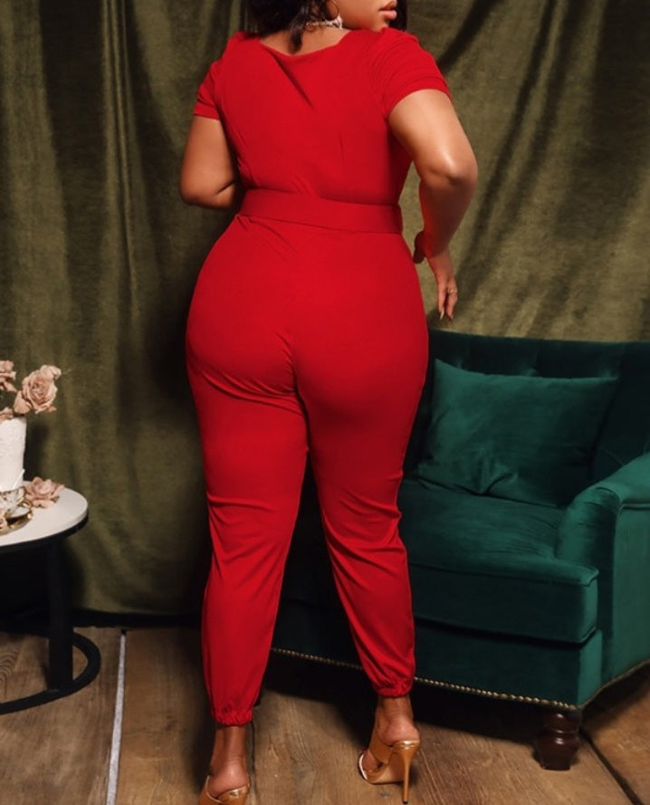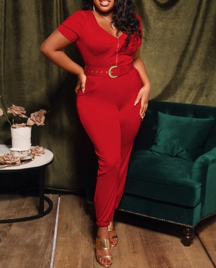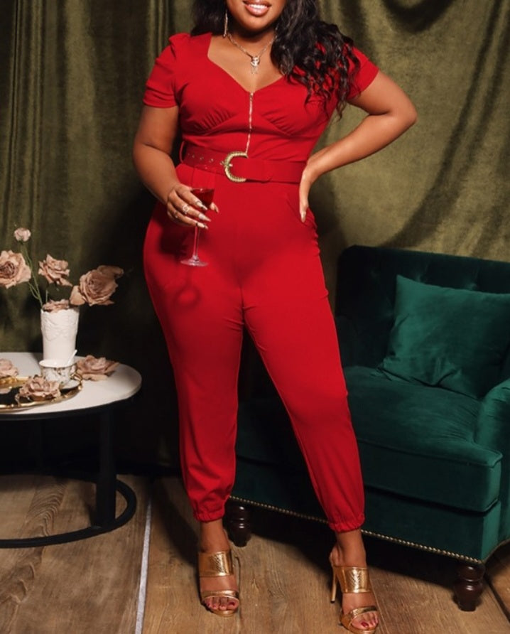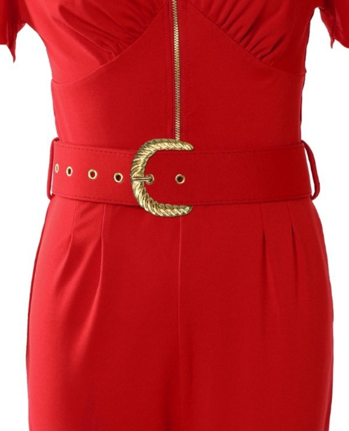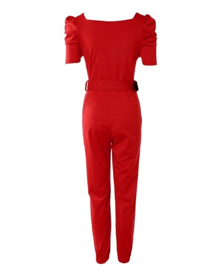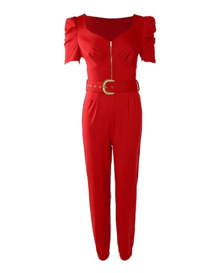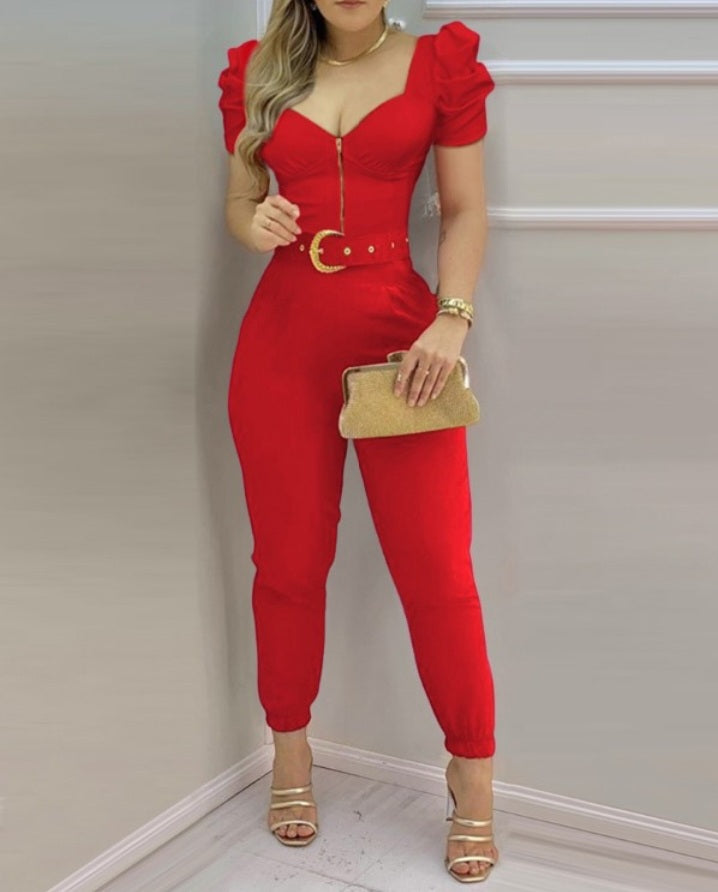 Combinaison à col en V avec fermeture éclair sur le devant et manches bouffantes, avec ceinture, salopette décontractée Femme