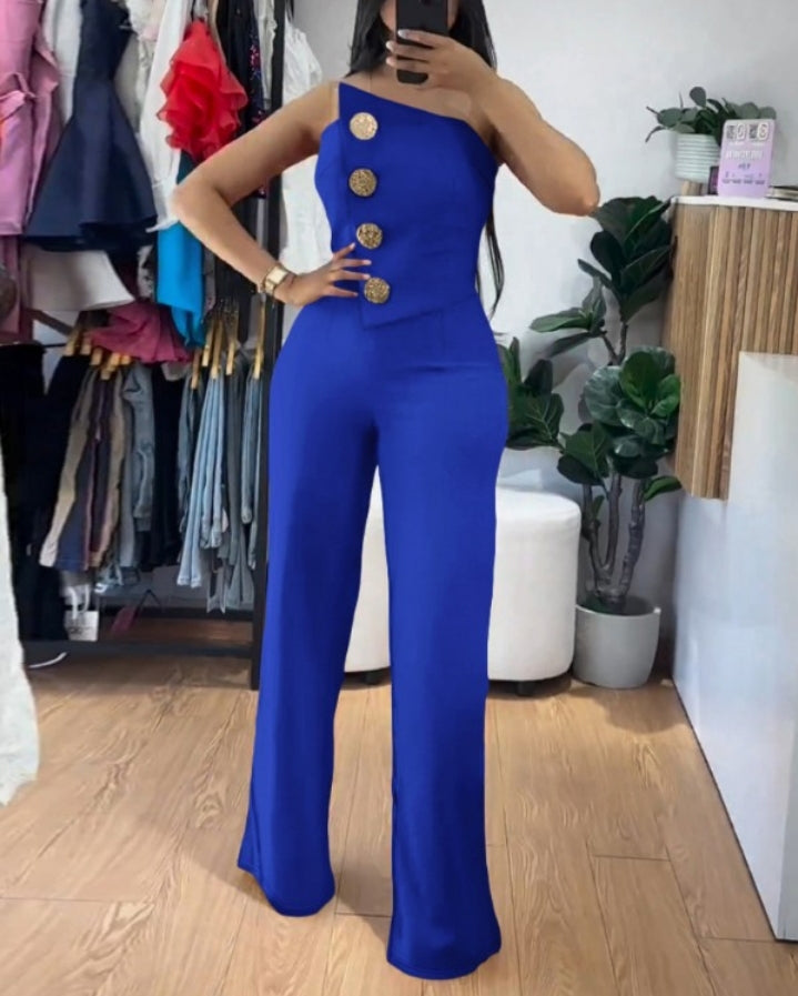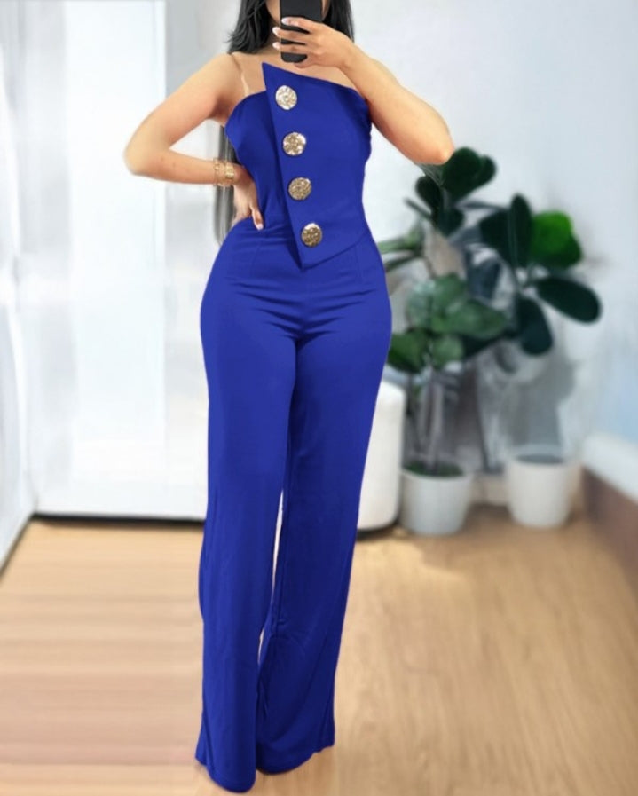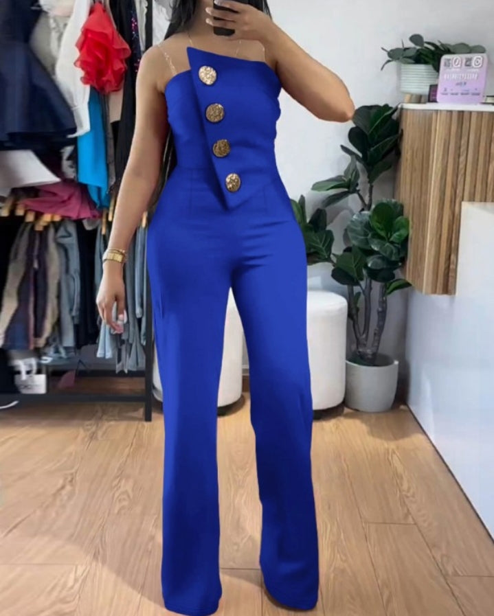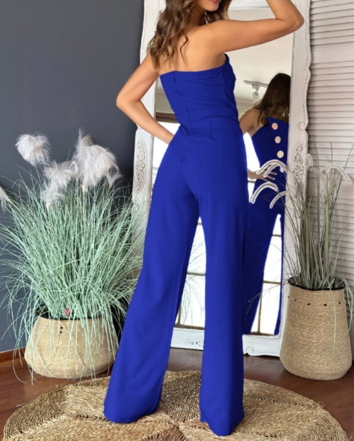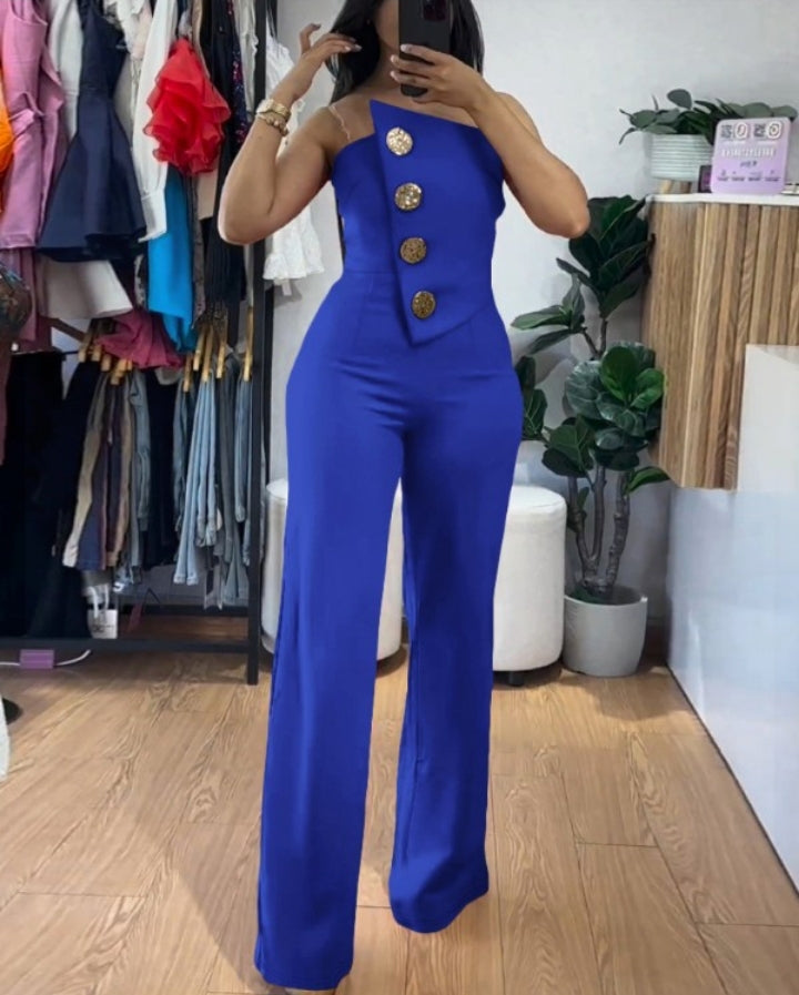 Élégance moderne : Combinaison bandeau asymétrique sans bretelles avec boutons métalliques et salopette décontractée Femme
