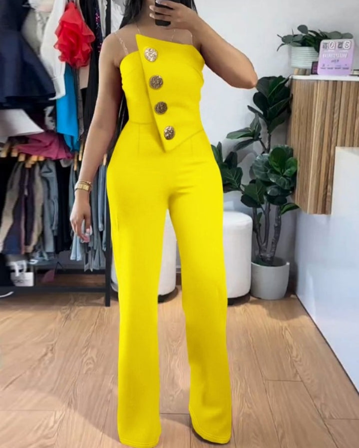 Élégance moderne : Combinaison bandeau asymétrique sans bretelles avec boutons métalliques et salopette décontractée Femme