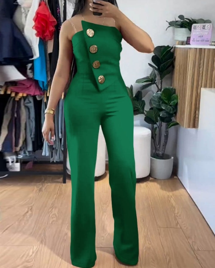 Élégance moderne : Combinaison bandeau asymétrique sans bretelles avec boutons métalliques et salopette décontractée Femme