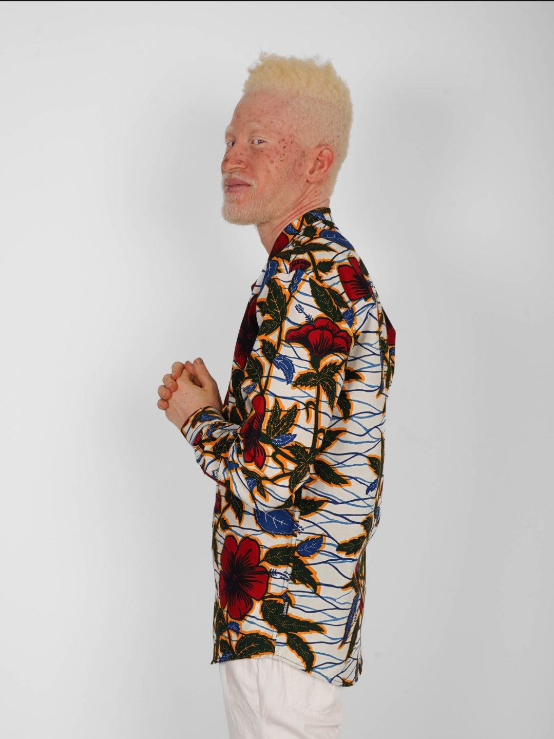 Cette chemise cintrée à manches longues tire son énergie d’un subtil mélange entre le wax et le coton unicolore.