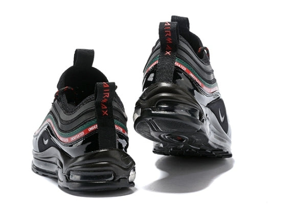 La silhouette est conçue en mesh, cuir et cuir verni noirs, contrastés par une ligne verte et une ligne rouge où on retrouve le branding Undefeated en blanc, le tout complété par une semelle noire. Un swoosh et un logo UNDFTD rouges sur la languette ainsi que le branding Air Max sur le talon finalisent la paire.