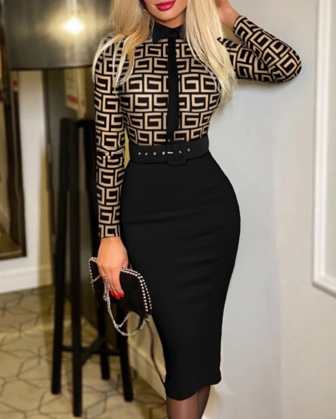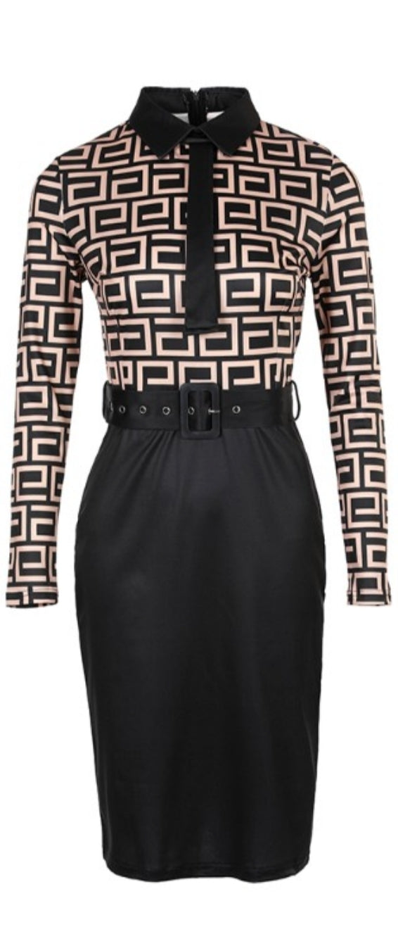 Robe de travail ceinturée à manches longues et imprimé géométrique