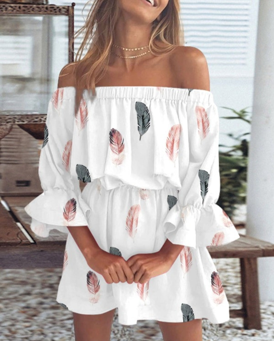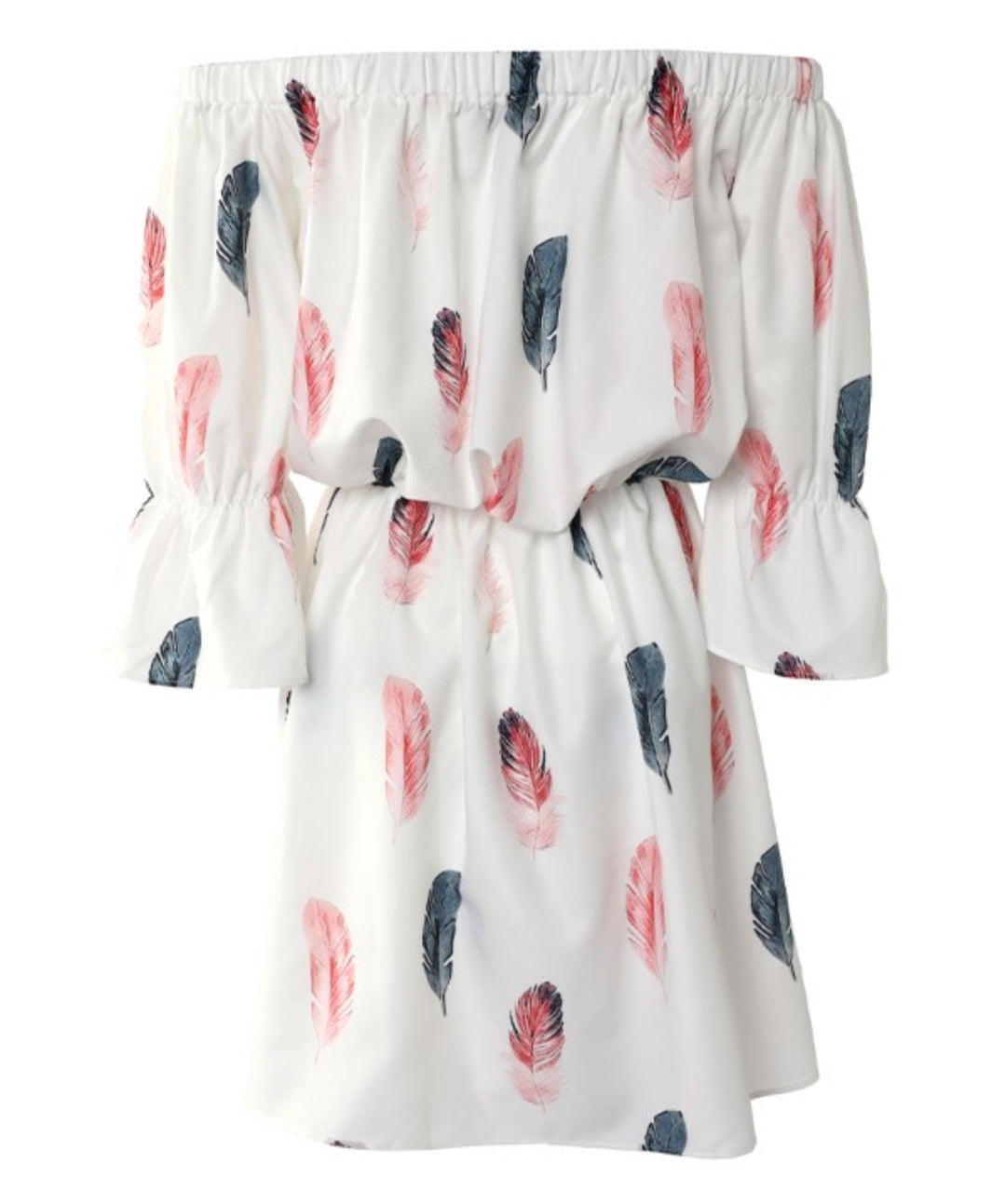 Robe décontractée à manches cloche et épaules dénudées à imprimé plumes