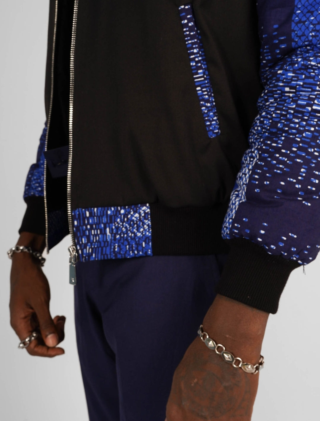 Ce bomber rembourré est confectionné en wax authentique, produit en Côte d’Ivoire et constitué à 100% de coton.