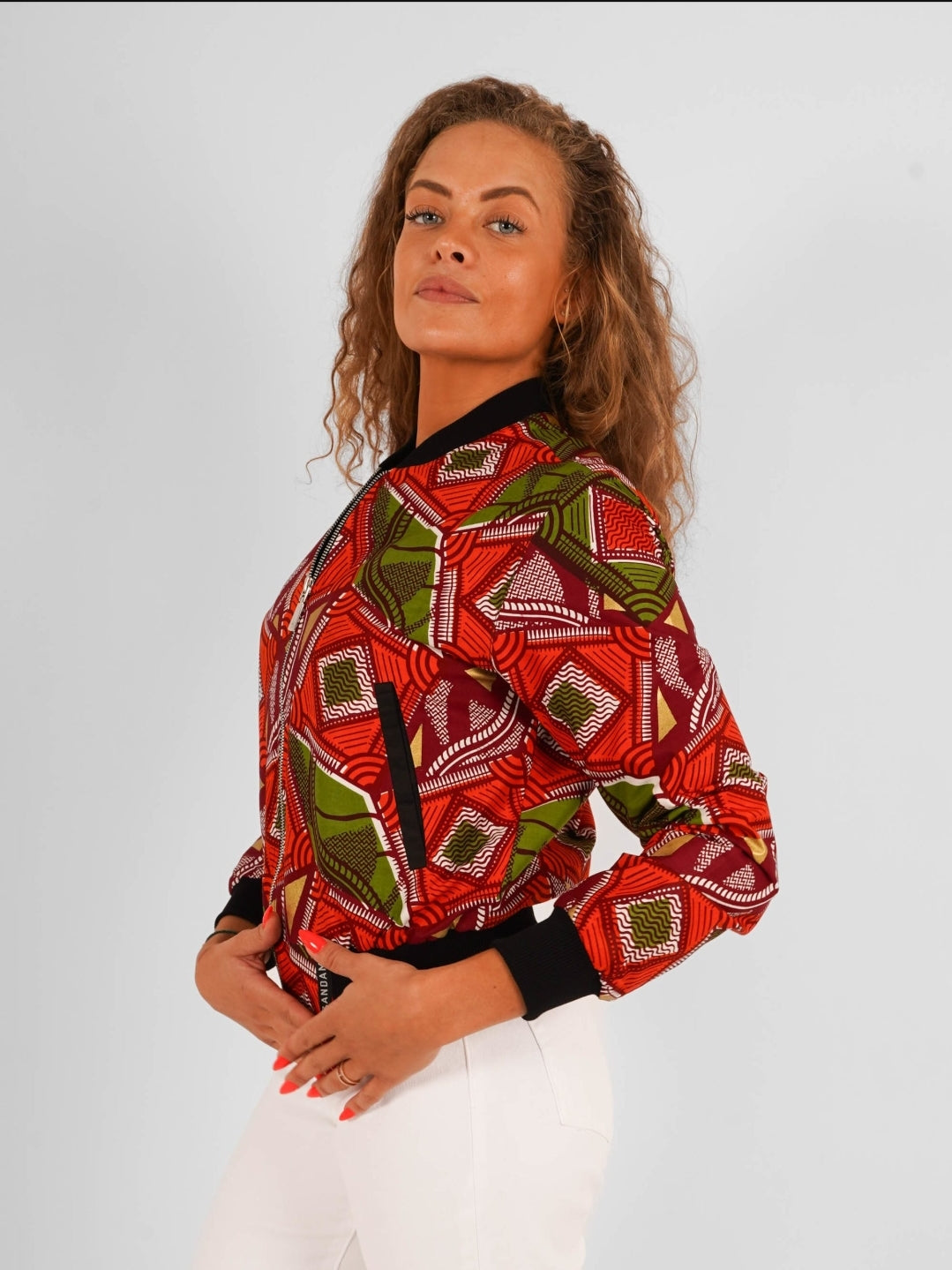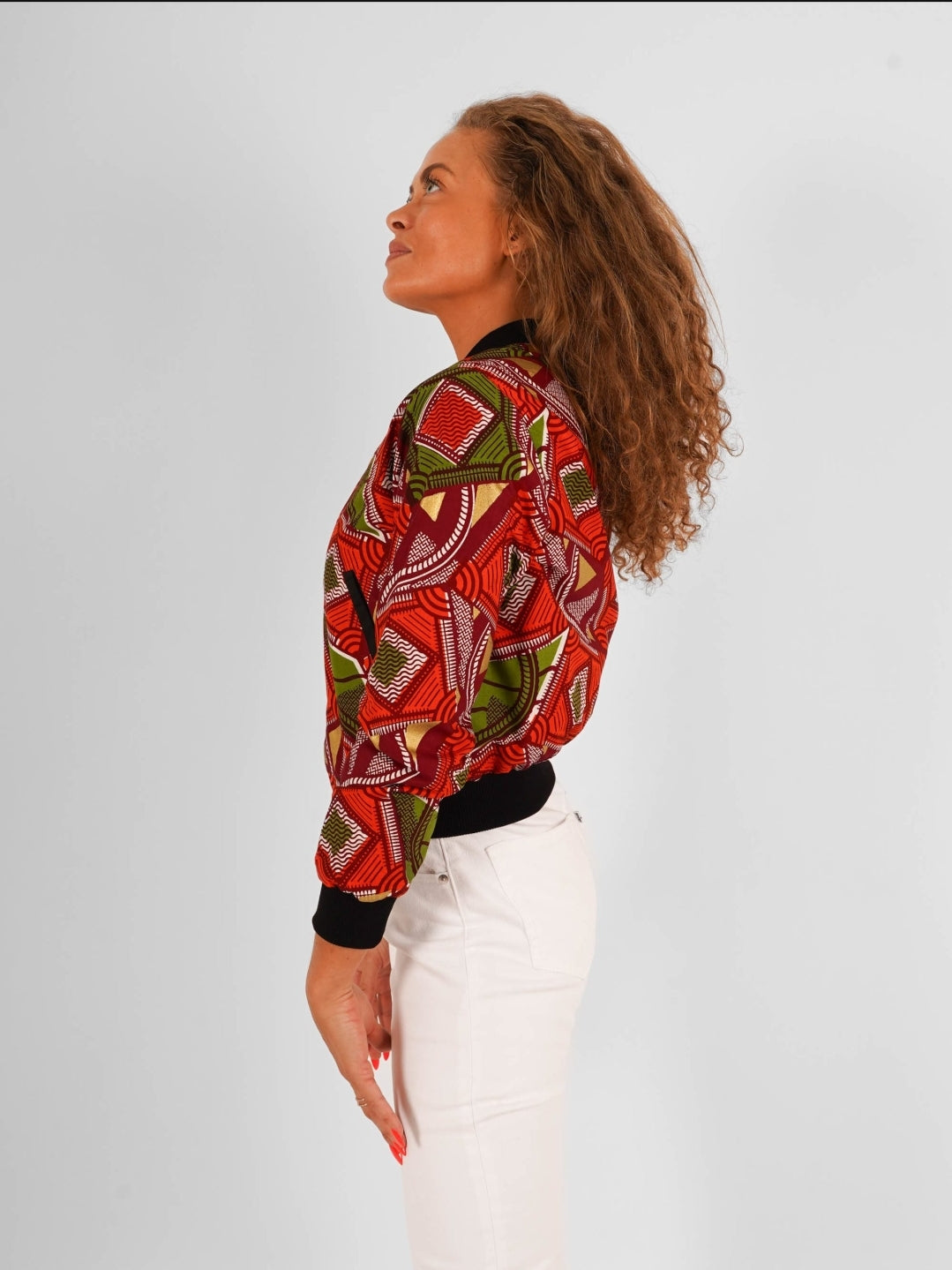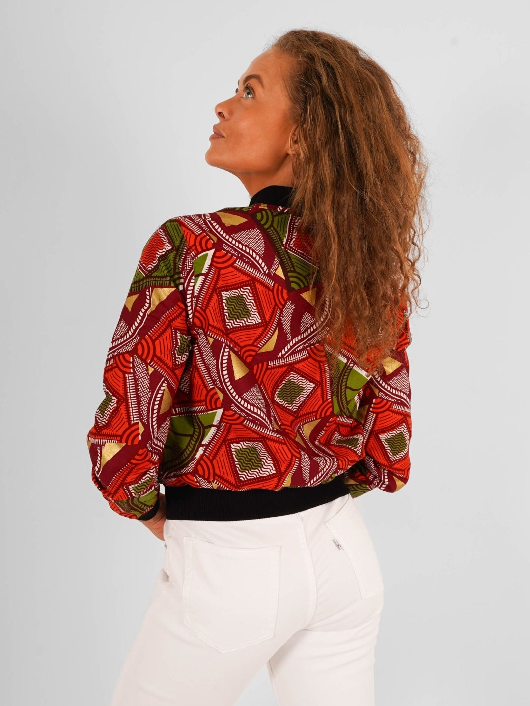 Ce bomber est confectionné en wax authentique, produit en Côte d’Ivoire et constitué à 100% de coton.