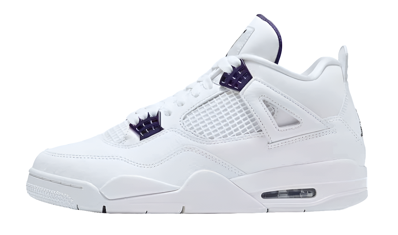 La Air Jordan 4 Retro Metallic Purple s’habille d’un upper en cuir premium blanc, accompagné d’empiècements quadrillés propres au modèle. On distingue quelques éléments violets métalliques, comme au niveau des oeillets, de la languette et du logo Jordan apposé sur le talon. La semelle blanche vient compléter la création en toute sobriété.