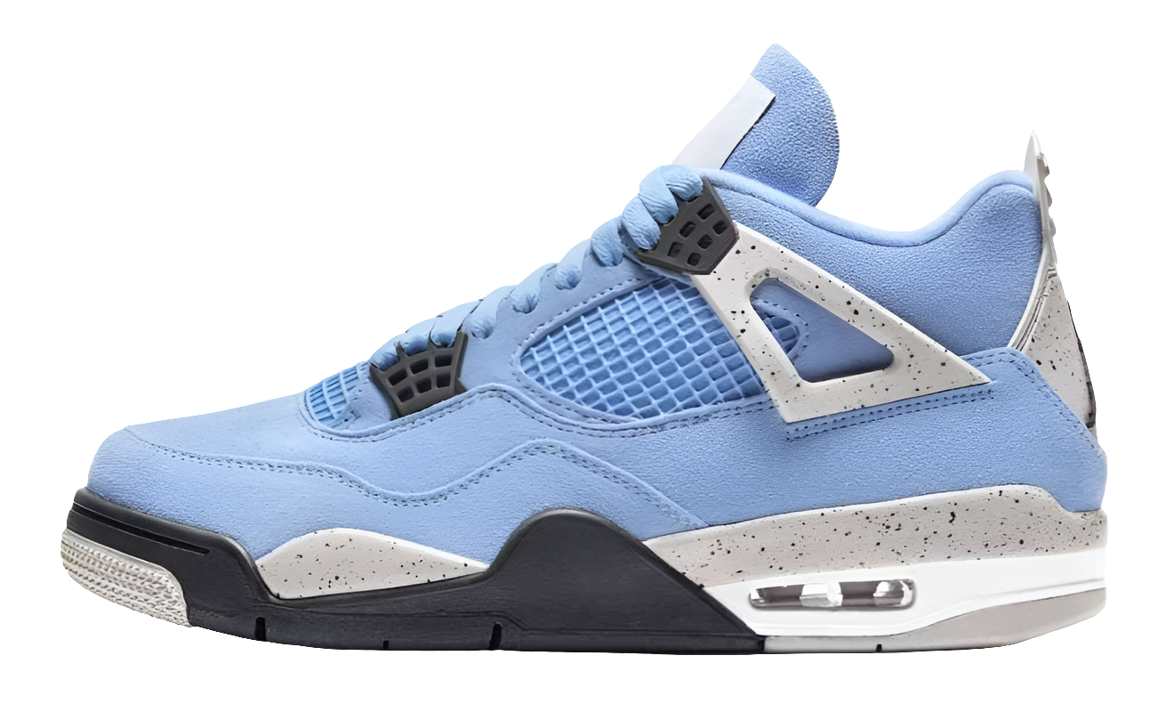 La Air Jordan 4 Retro University Blue a un upper en daim bleu ciel, accompagné d’un filet en TPE et de lacets assortis. Le design est complété par l’incontournable motif Cement Print sur les Wings, le talon et une bonne partie de la midsole. Un nouveau tag tricolore sur la languette apporte la touche finale.