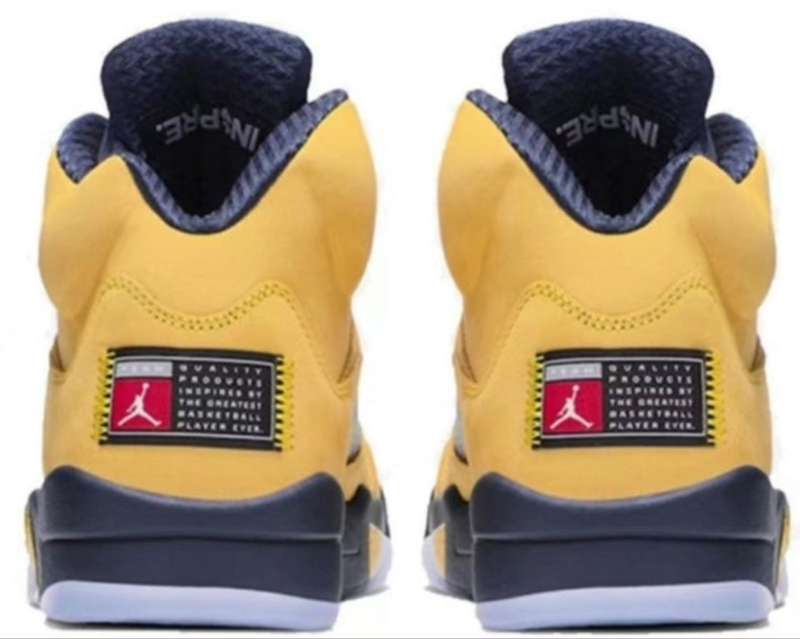 Reprenant le code couleurs de l’équipe des Wolverines, cette Air Jordan 5 Michigan « Inspire » adopte une base en daim jaune.