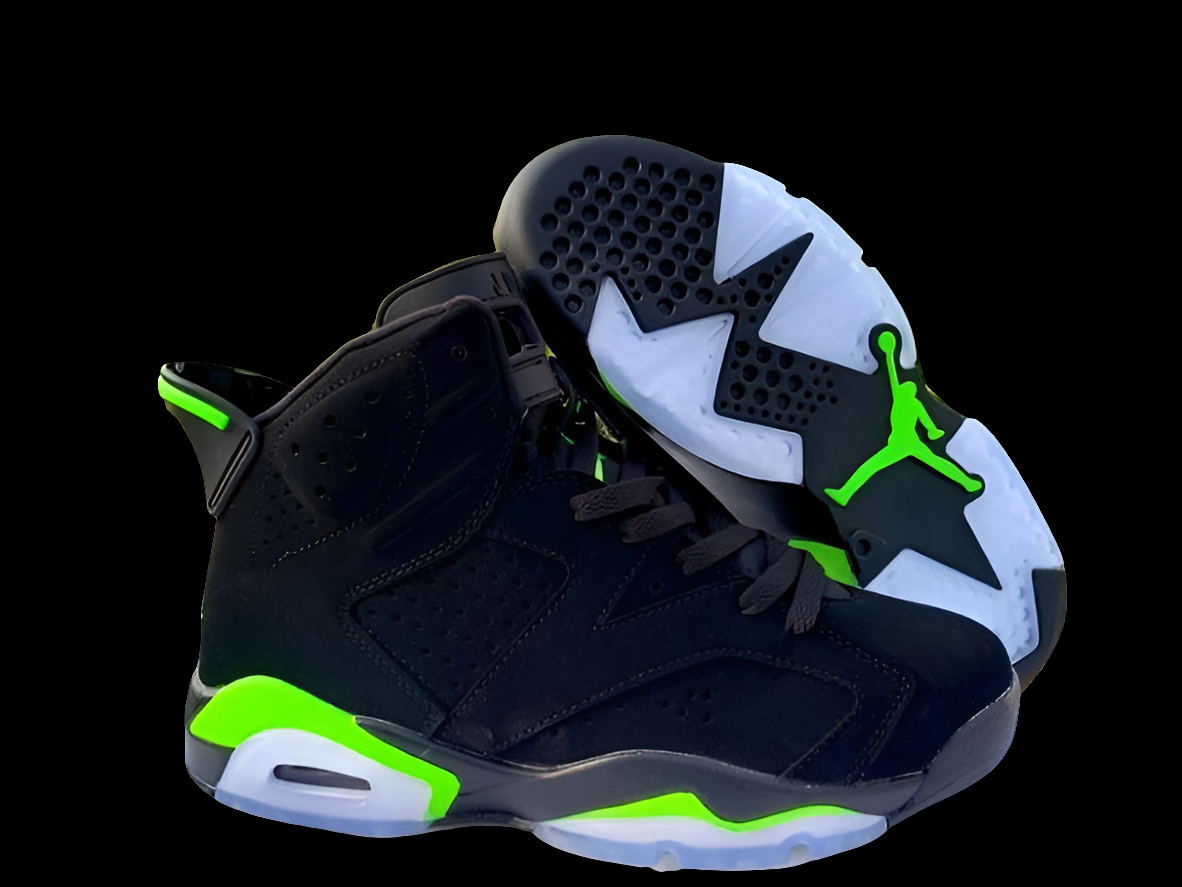 La Air Jordan 6 Retro Electric Green se compose du design original inspiré de la Jordan 5, notamment en raison de la présence d'une semelle Icy. Cette dernière se veut néanmoins plus légère et plus fine que sa compère et se compose en grande majorité de suède. En ce qui concerne le coloris, on retrouve une base noire rehaussée d'accents fluorescents sur la languette. On retrouve cette teinte vert électrique au niveau de la midsole qui accompagne une outsole phosphorescente.