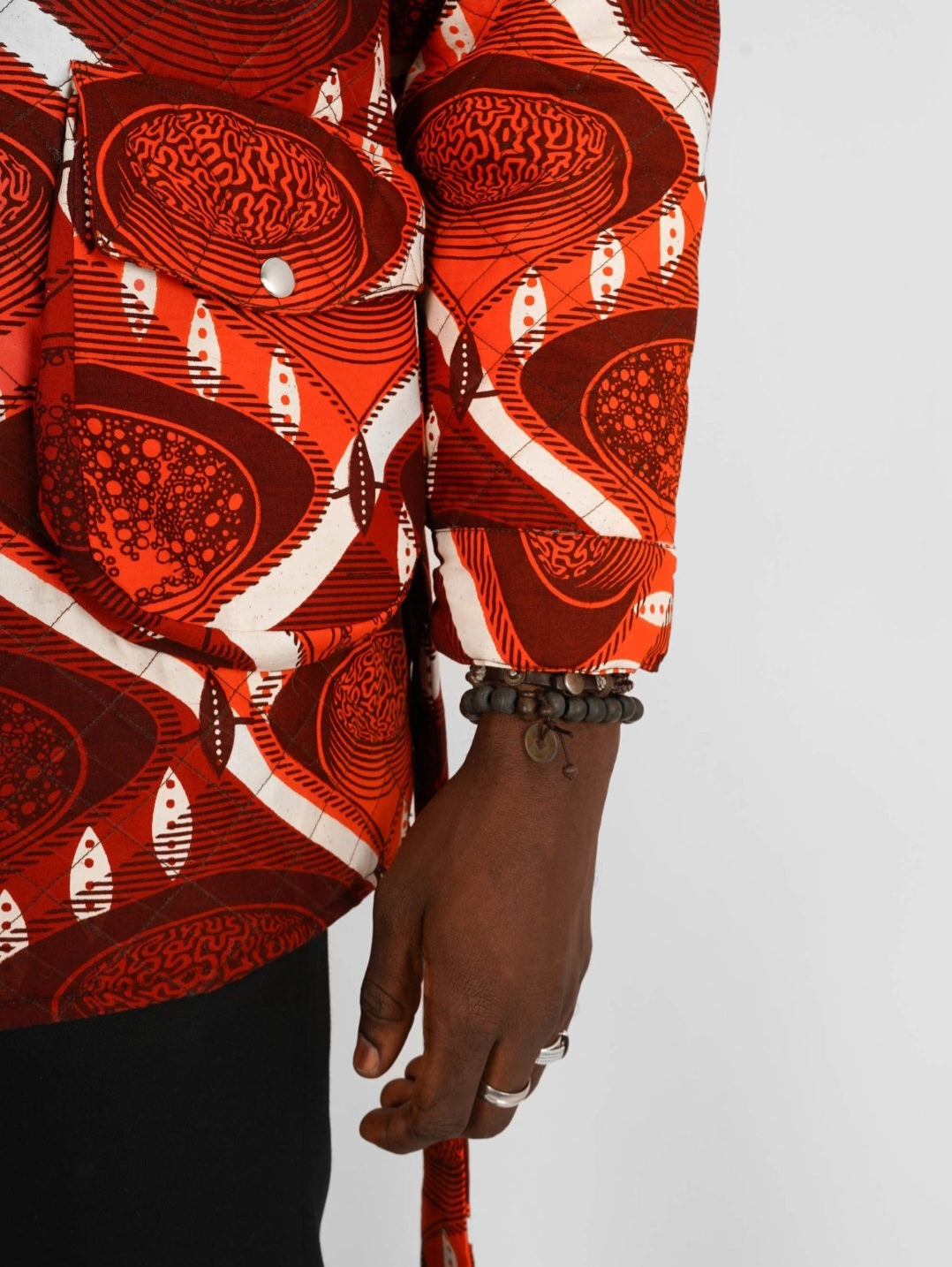 Cette veste matelassée rembourrée est confectionnée en wax premium authentique, produit en Côte d’Ivoire et constitué à 100% de coton.