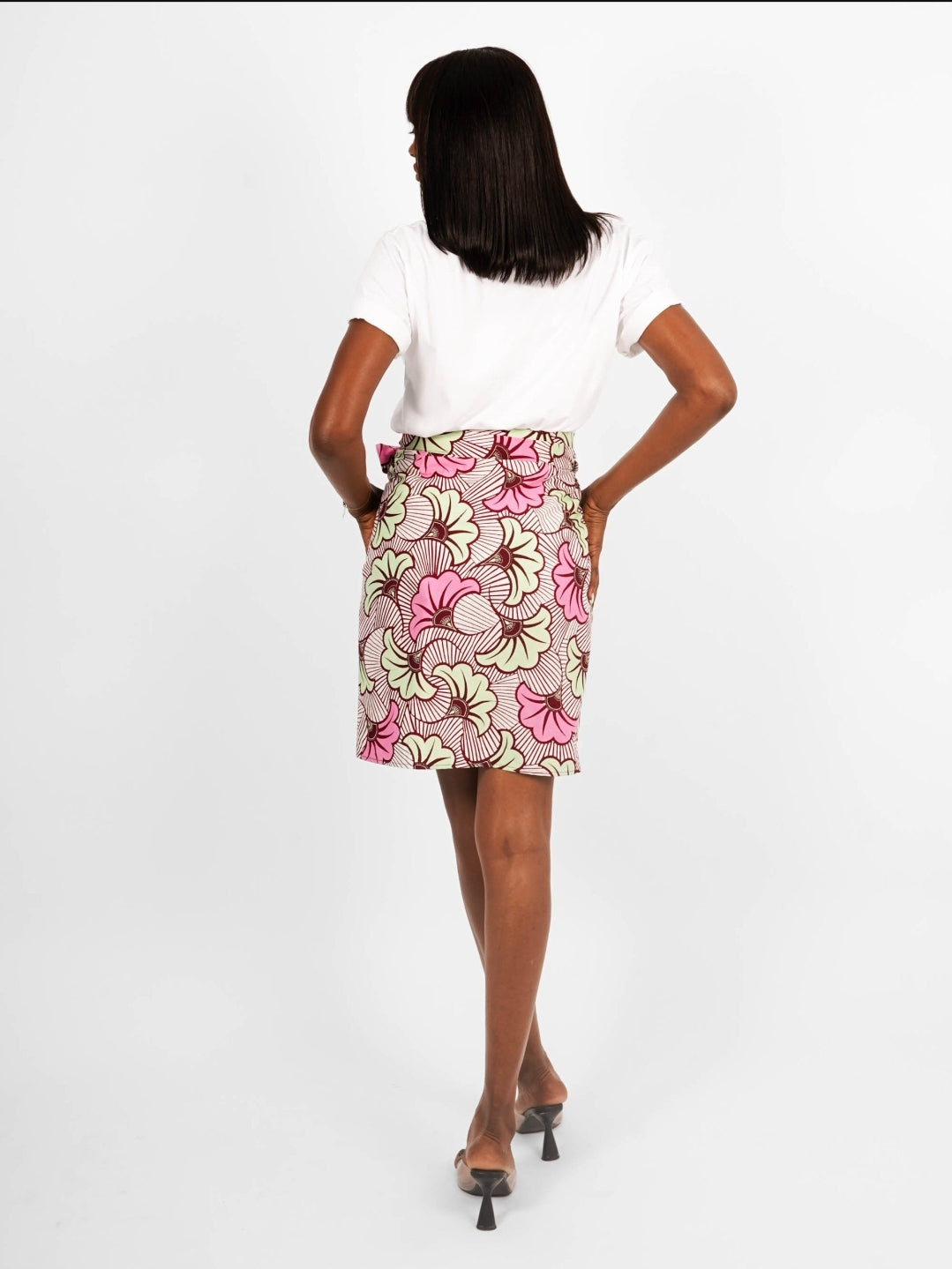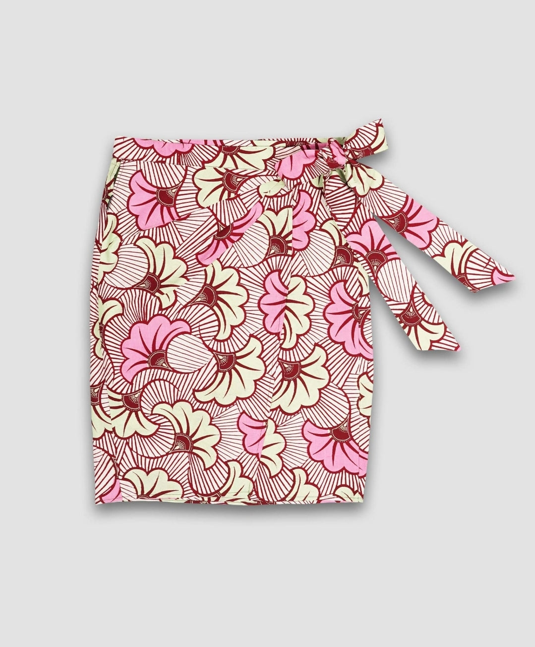 Cintrée à la taille et ajustable par nœud, cette jupe est confectionnée en wax authentique, produit en Côte d’Ivoire et constitué à 100% de coton.