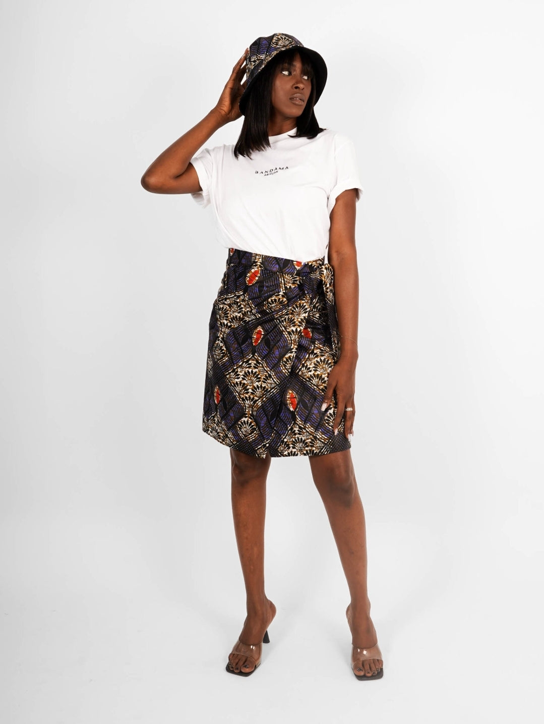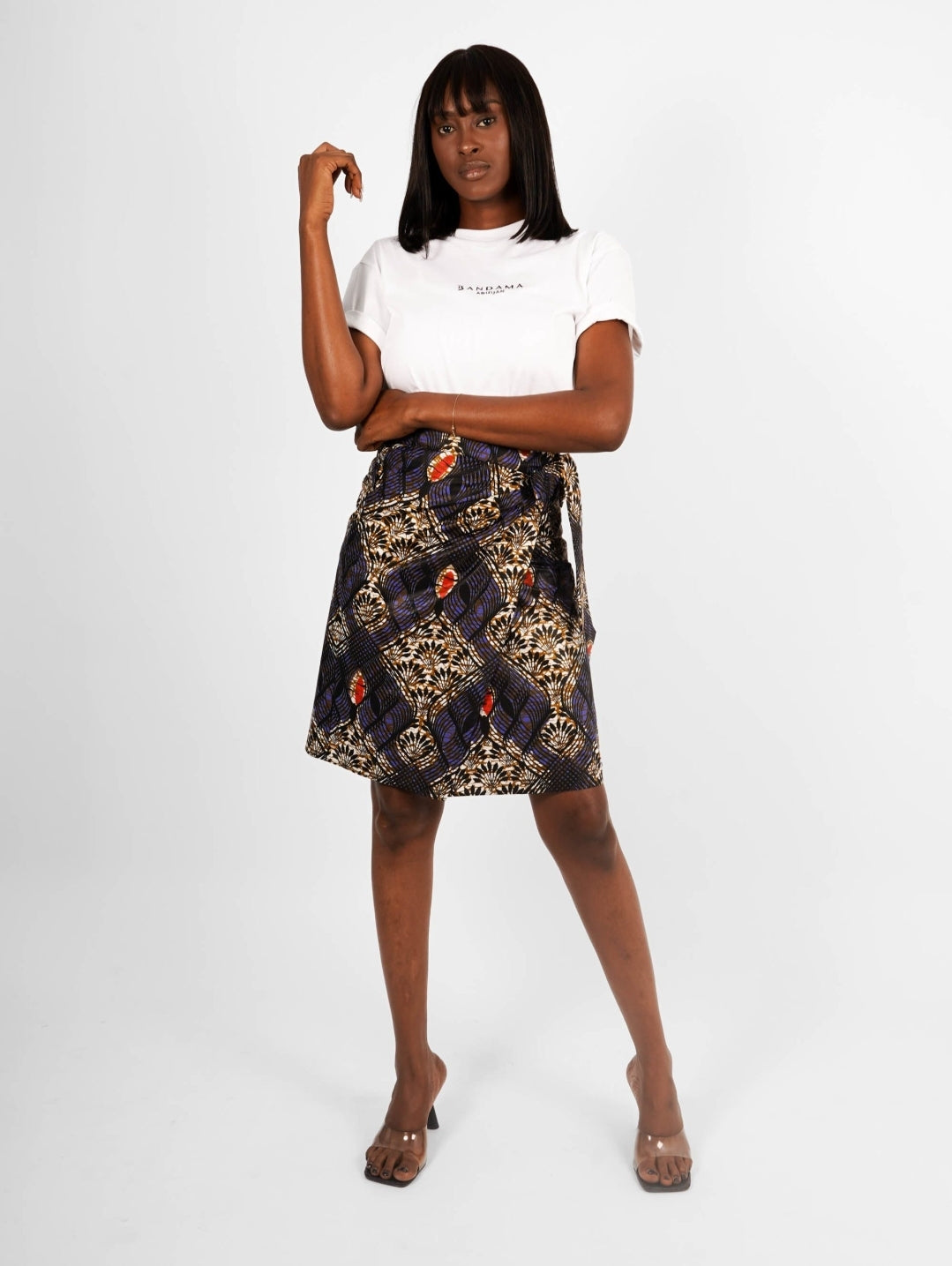 Cintrée à la taille et ajustable par nœud, cette jupe est confectionnée en wax authentique, produit en Côte d’Ivoire et constitué à 100% de coton.