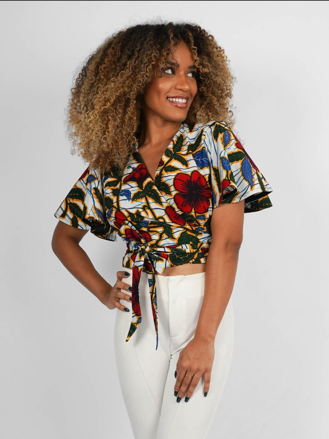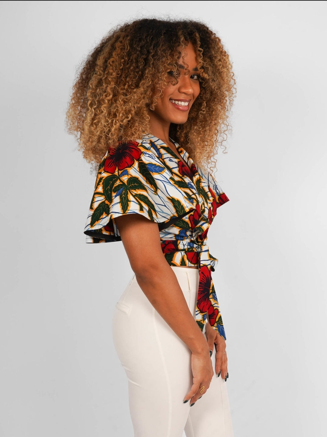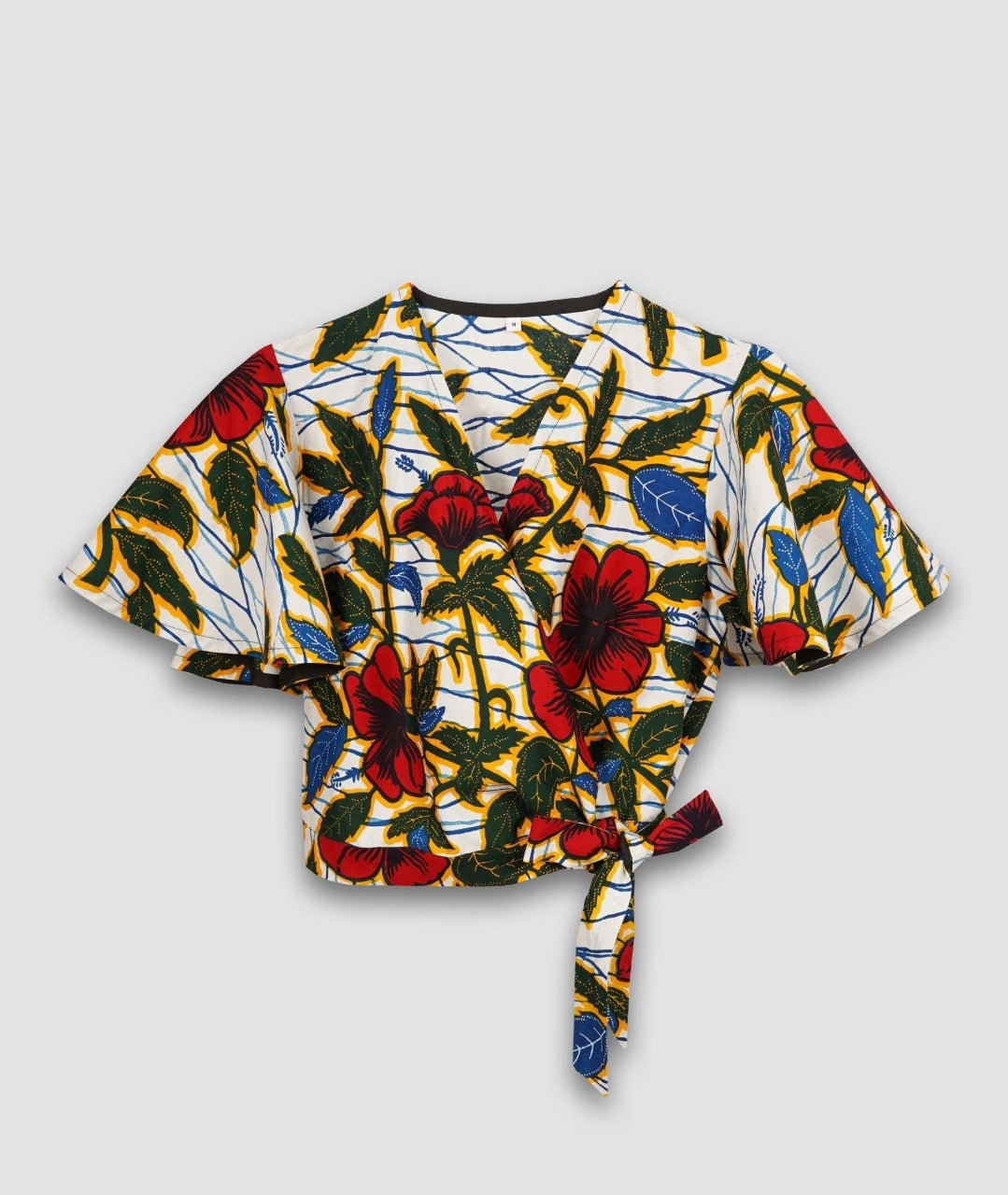 Ce top est confectionné en wax authentique, produit en Côte d’Ivoire et constitué à 100% de coton.