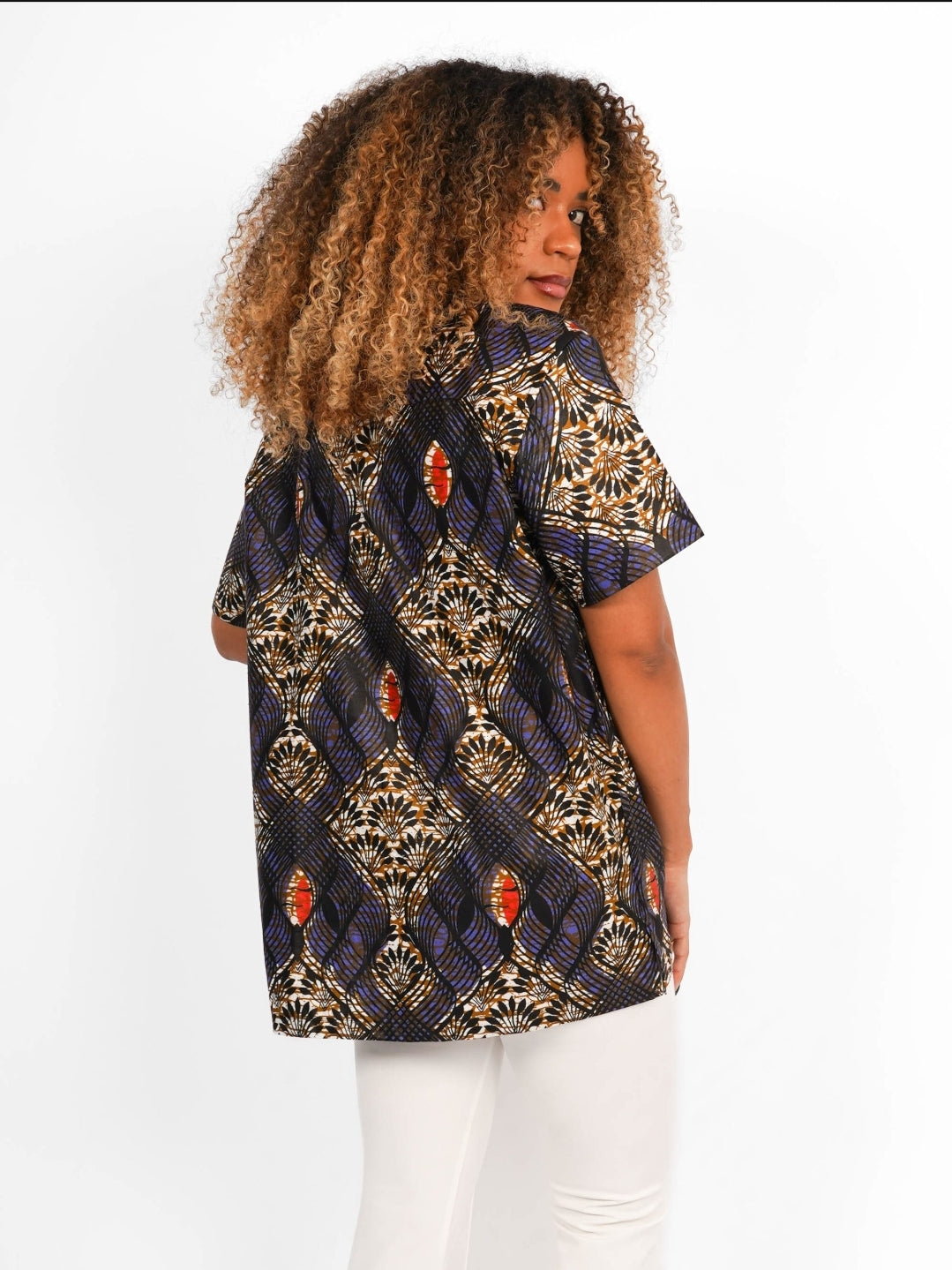 Cette chemise est confectionnée en wax authentique, produit en Côte d’Ivoire et constitué à 100% de coton.
