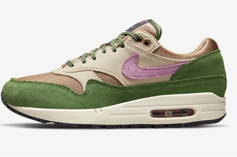 En effet, la silhouette de Tinker Hatfield présente une base en mesh marron clair, complimentée par des superpositions en daim vert et cuir beige. On distingue également des accents mauves sur les brandings comme le swoosh latéral, des lacets bicolores, ainsi qu’un « Nike Air Max » à la place du traditionnel « Nike Air » sur les talons.