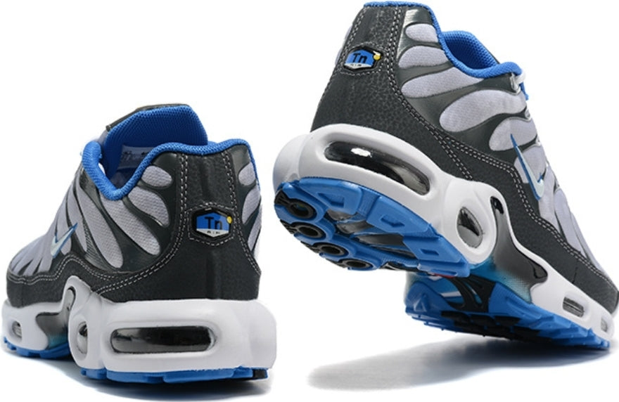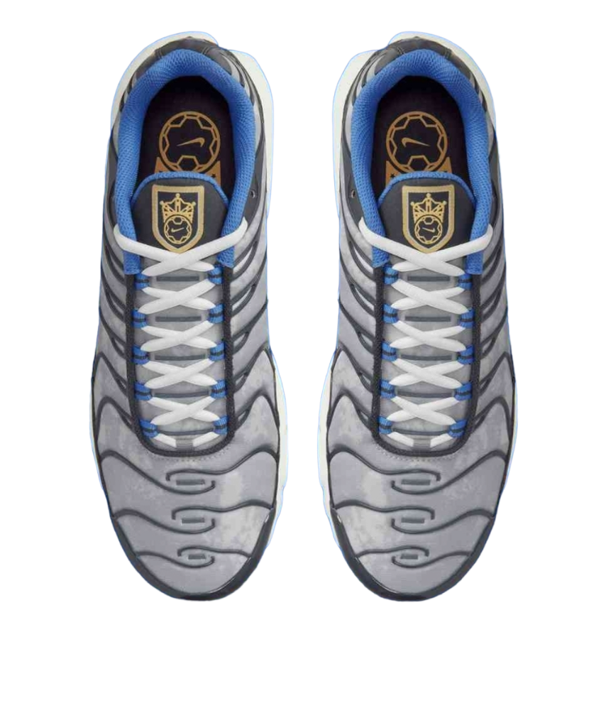 La Nike Air Max Plus SE Social FC reprend la structure habituelle du modèle agressif signé Sean McDowell. Elle affiche une base grise au motif nuageux ainsi qu'une cage en TPU noir, assortie au mudguard, tandis que des détails bleus apportent de la couleur. Sur la languette, on distingue le logo du Nike Social FC, qui a pour ambition de rassembler tous les fans de foot et de la marque au Swoosh.