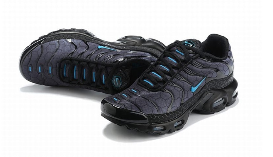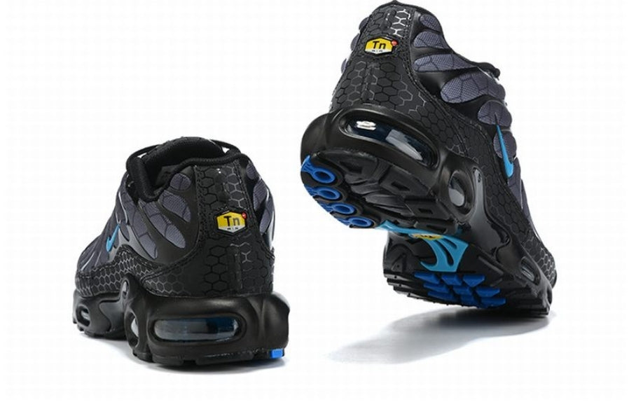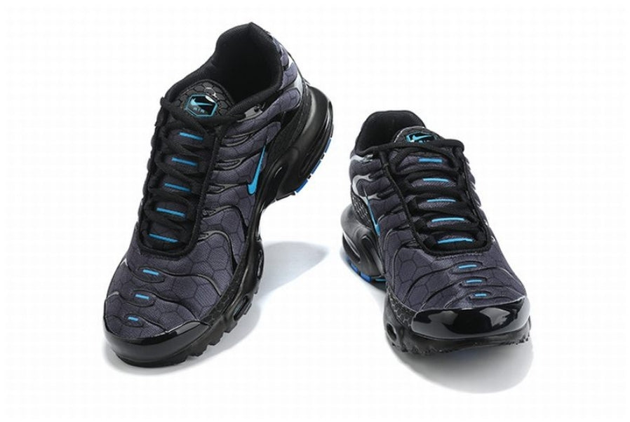 L'empeigne en maille serrée présente un design hexagonal argenté et noir unique sur le textile qui est mis en évidence lorsque les lumières s'éteignent grâce à la technologie réfléchissante, au-dessus et offrant un soutien sont les unités de cage noires qui offrent un ajustement sûr. Courir le long des garde-boue est un motif hexagonal sur le thème, qui est porté à travers la superposition du talon. À la base de la conception se trouvent une unité de semelle intermédiaire et extérieure entièrement noire avec des fenêtres translucides sur le rembourrage TN bleu. Le swoosh Laser Blue, les accents affichés sur la langue et la marque TN située sur le talon et la semelle extérieure complètent le look.