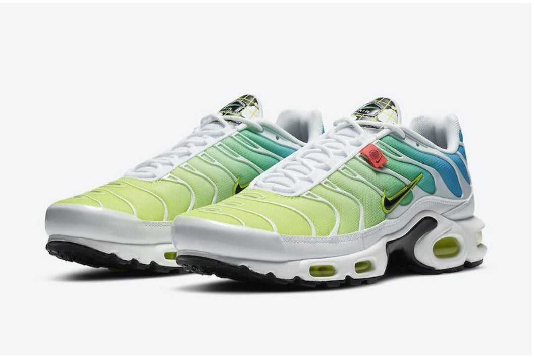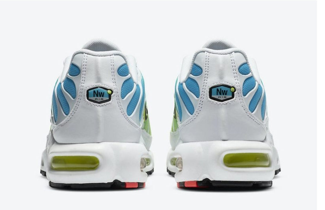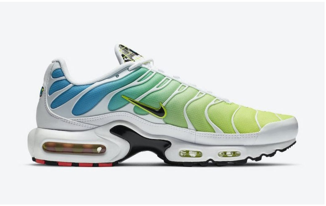 Les swooshes du profil et les graphiques du globe sur la languette participent également à un maquillage "Volt", tandis que les étiquettes latérales introduisent une touche de cramoisi dans le mélange. Les unités de la semelle sous le pied conservent leur design standard tout en arborant la palette susmentionnée, mais pas le marquage au talon. Au lieu de cela, les badges "Tn Air" se lisent "Nw Air" comme un rappel de l'inclusion de la paire dans le "Worldwide Pack" de Nike.