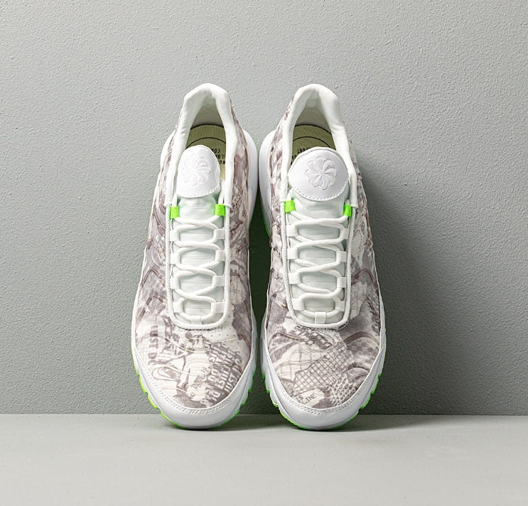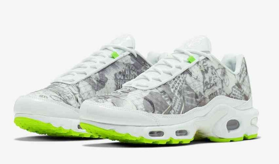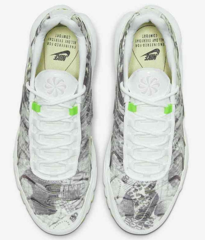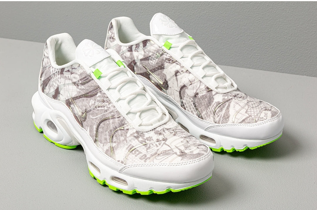 La division Nike Sportswear nous propose aujourd’hui un nouveau coloris estival destiné à la gente féminine. La paire dispose d’une tige recouverte d’un imprimé gris et blanc, compilant une multitude de brandings rétros, d’un exosquelette argenté et de superpositions en cuir verni blanc. Quelques touches de vert fluorescent sur les oeillets supérieurs et l’outsole, le logo Tuned Air sur le talon, ainsi qu’une swoosh latéral translucide, apportent la touche finale.