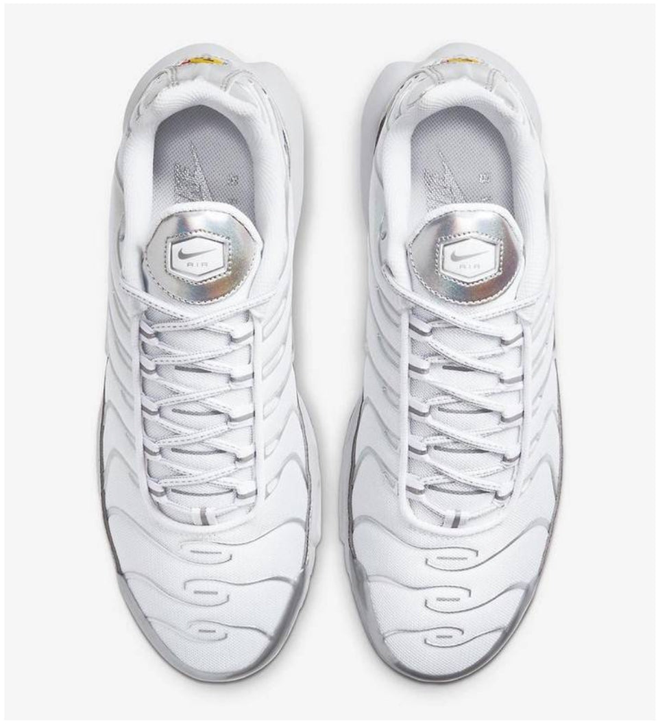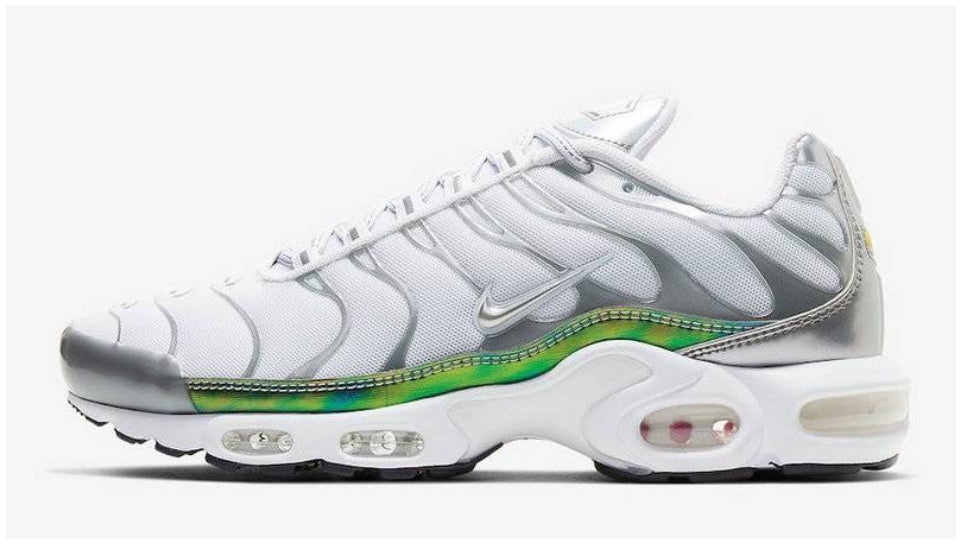 Pour une sneaker dont le design a été largement inspiré des plages de Floride, la Nike Air Max Plus a continué à attirer une grande notoriété au Royaume-Uni et en Australie, en grande partie grâce à ses premiers coloris et à son prix élevé. Bien qu'abandonnant les dégradés audacieux, l'arrangement chromé du modèle à venir conserve la personnalité qui a fait de la sneaker un "Best-Seller" à l'étranger. Les bases textiles optent pour un style «blanc» qui prend le pas sur les détails les plus emblématiques de la silhouette de 1998. Les lignes en TPU ressemblant à des palmiers s'étendent sur l'intégralité de la tige et revêtent une finition argentée métallique ; Les superpositions de l'avant-pied, de la languette et du talon emboîtent le pas dans l'arrangement scintillant. Ailleurs, les garde-boue sous les Swooshes à profil poli introduisent un éclat divergent «Metallic Green». Les semelles intercalaires et les semelles extérieures ne participent à aucune des esthétiques brillantes ou grasses, mais l'unité de talon Air visible de la première arbore une légère teinte orange.