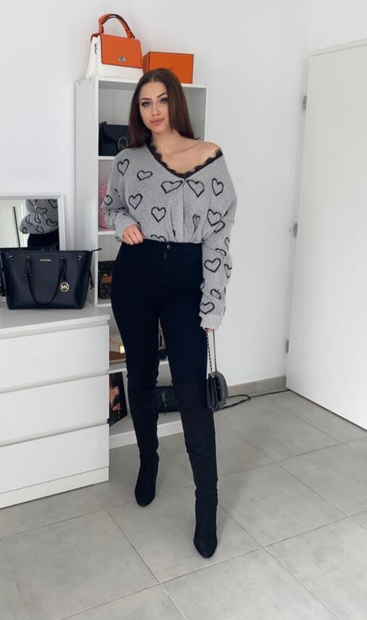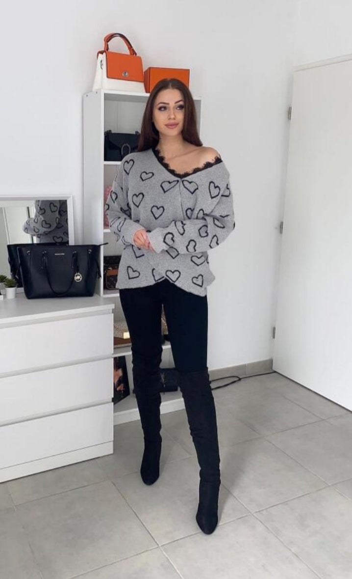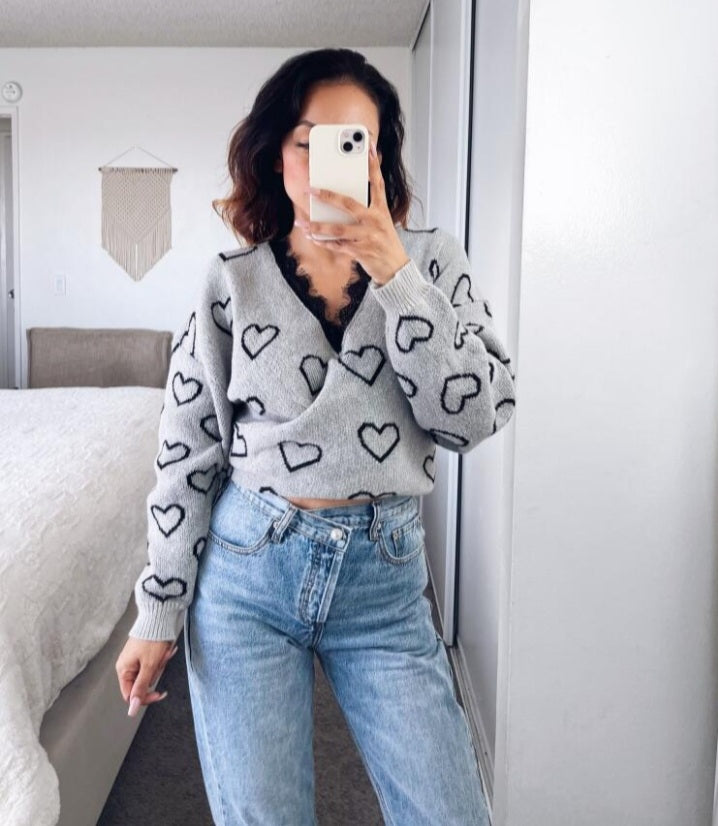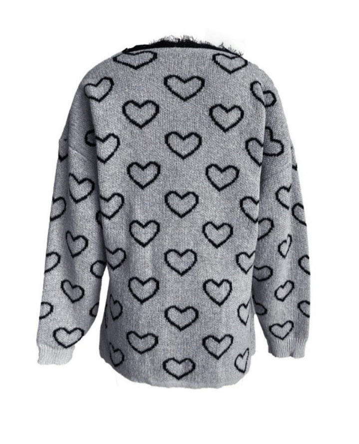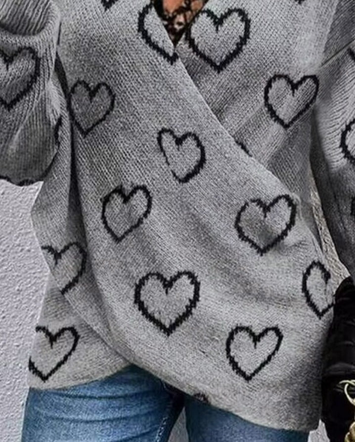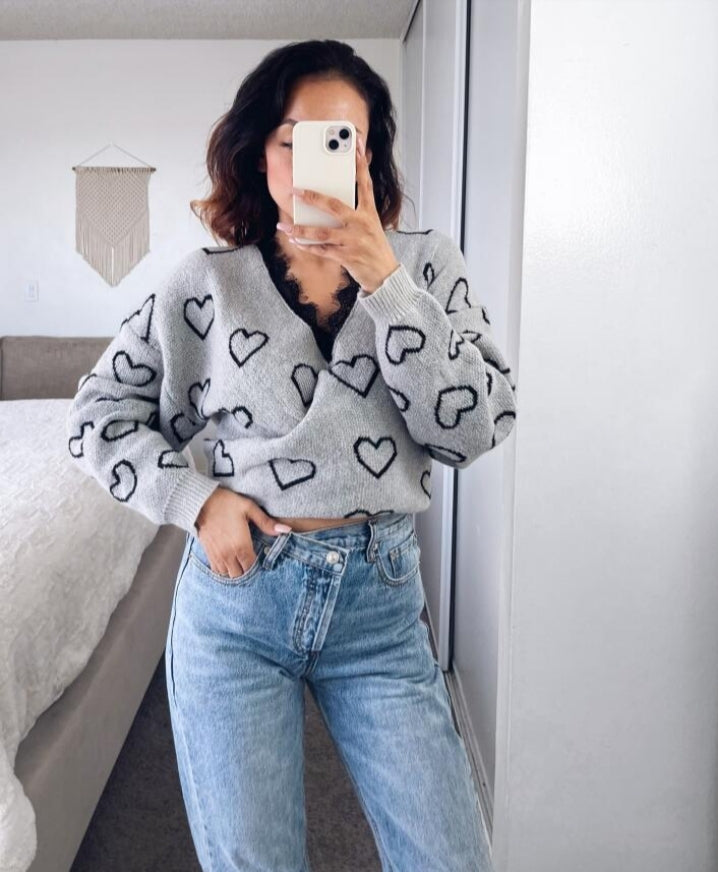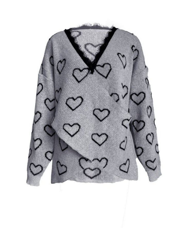 Pull cache cœur en tricot à manches longues et dentelle contrastée
