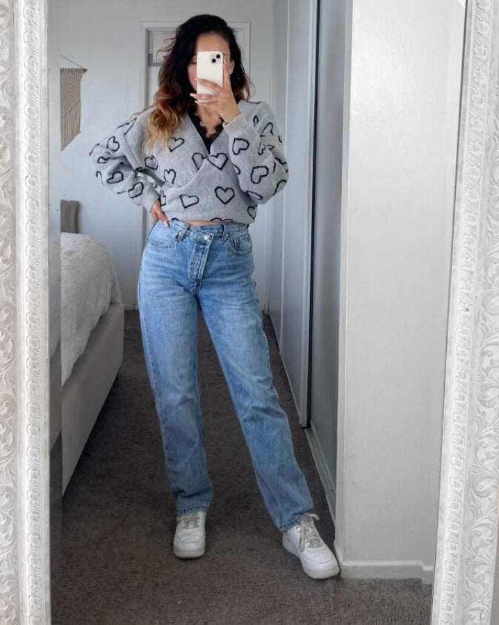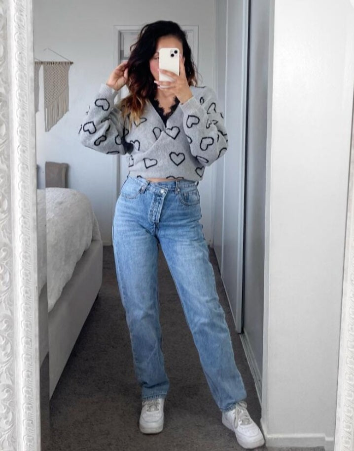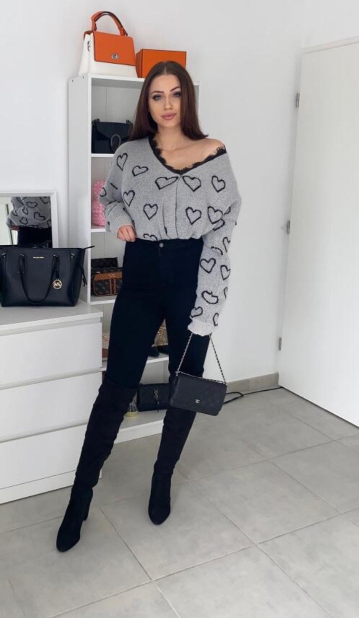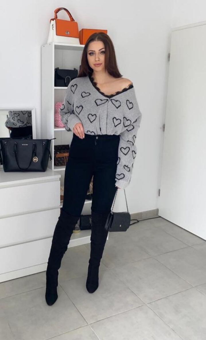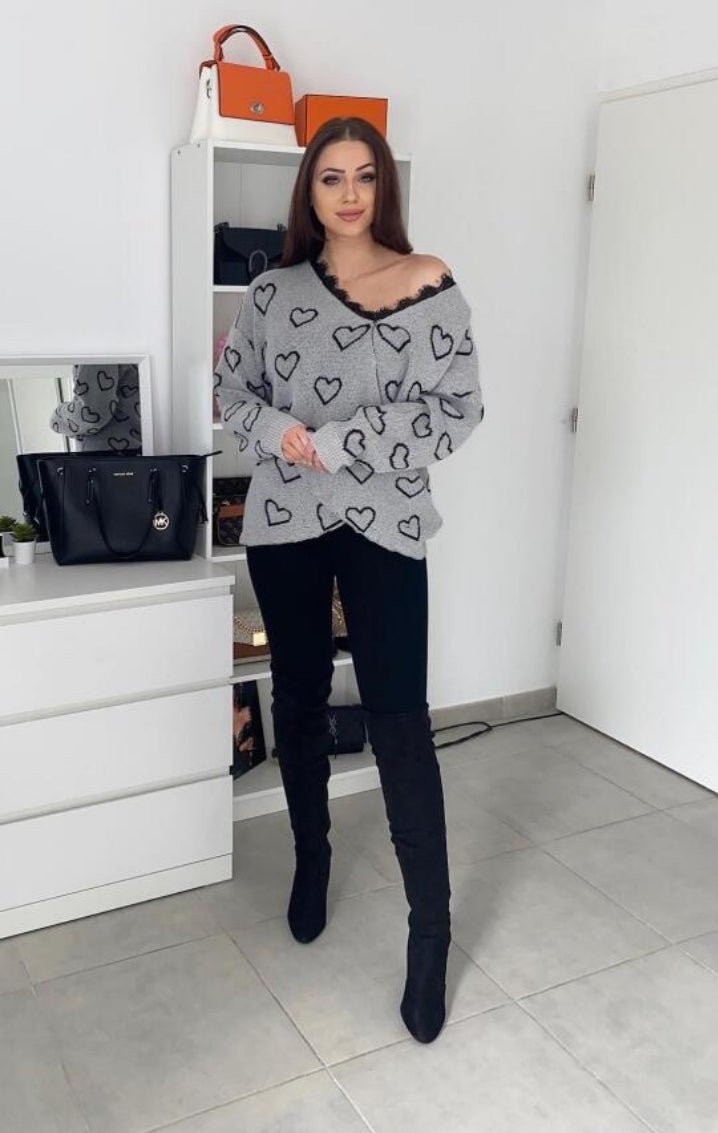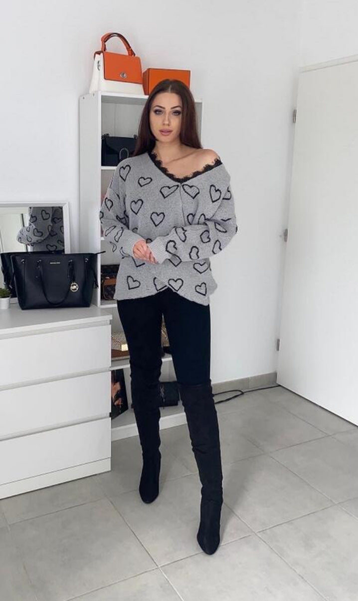Pull cache cœur en tricot à manches longues et dentelle contrastée